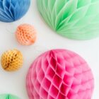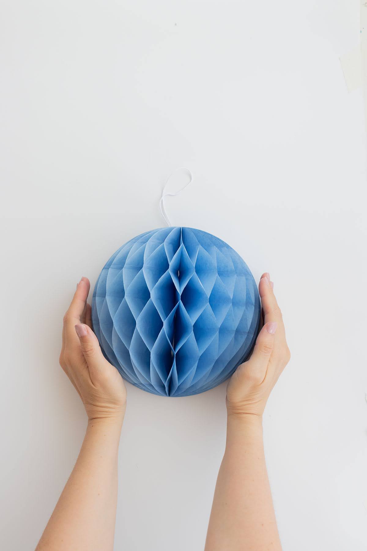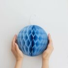 Bola de nido de abeja de papel seda en color azul. El producto viene plegado, listo para abrir y montar, trae una cuerdita para colgarlas.