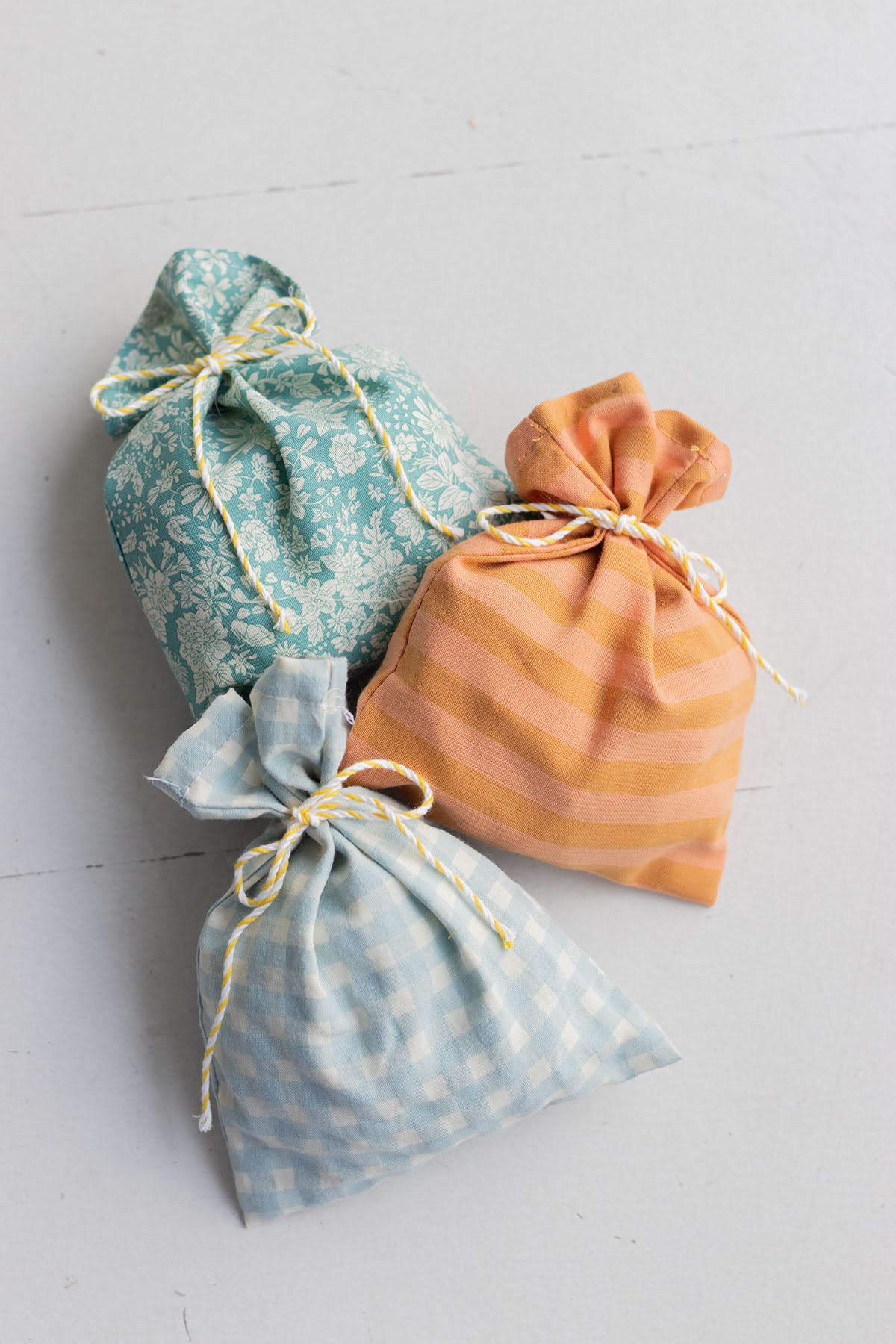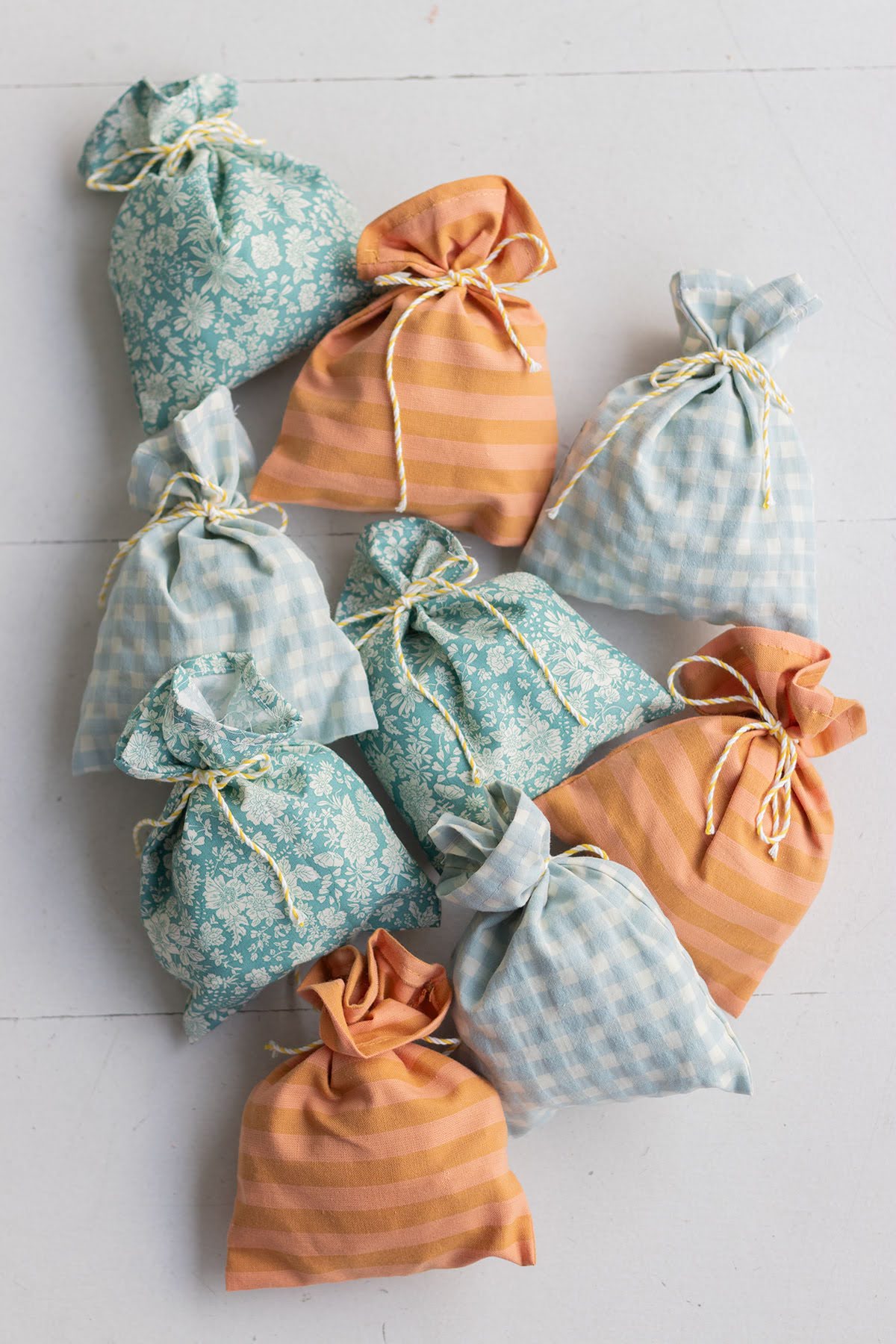 Están hechas con tela Liberty, rayas y vichy, van rellenas con una bolsita de chuches, un globo y un silbato! . Miden 12x16cm