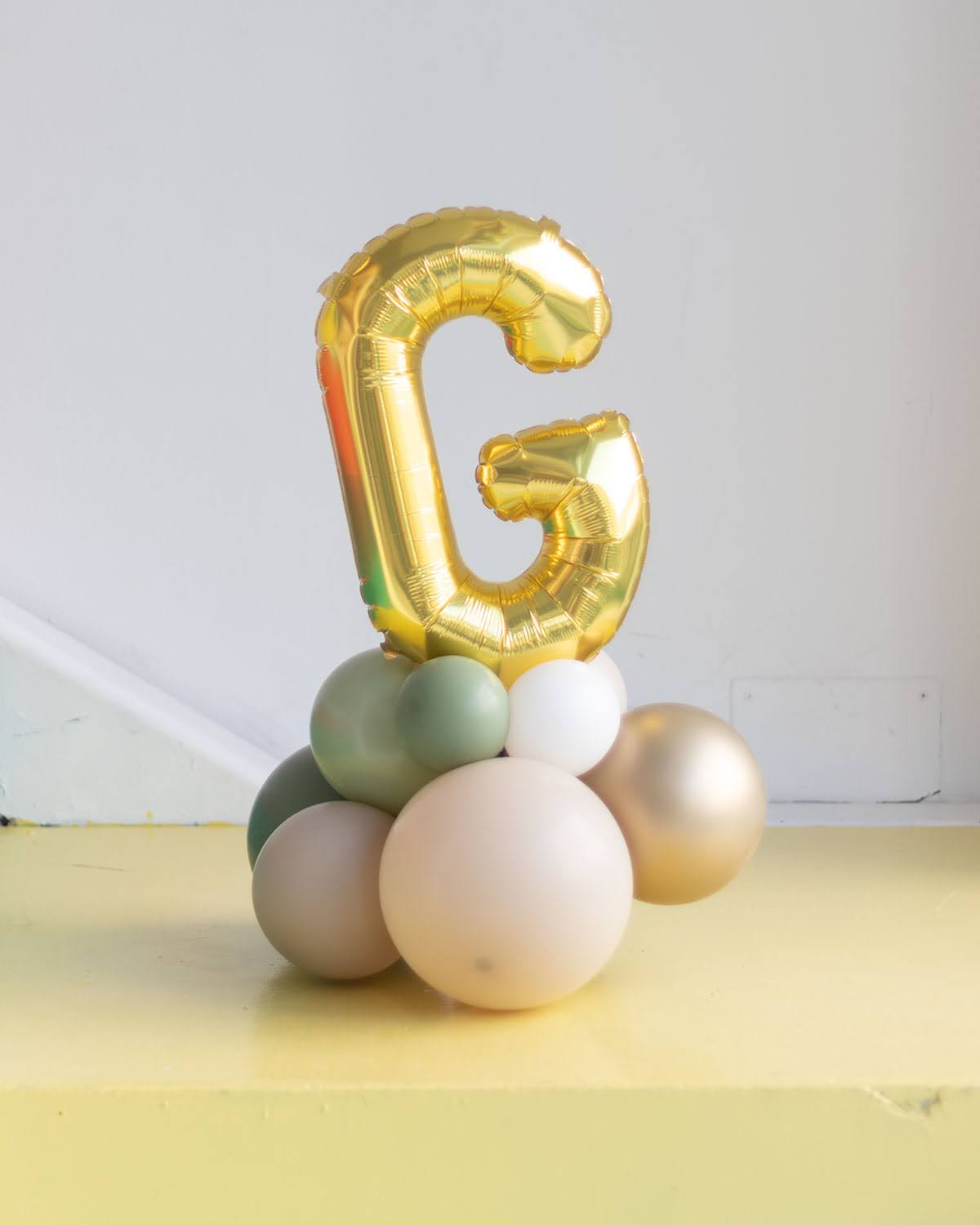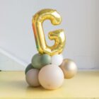 Bonito centro de mesa de globos de látex biodegradable en tonos blanco, eucalipto y oro con un globo de foil metalizado en color oro con forma de la inicial que elijas, todos hinchados con aire. La base mide 30x30cm aproximadamente y 50cm de alto.