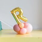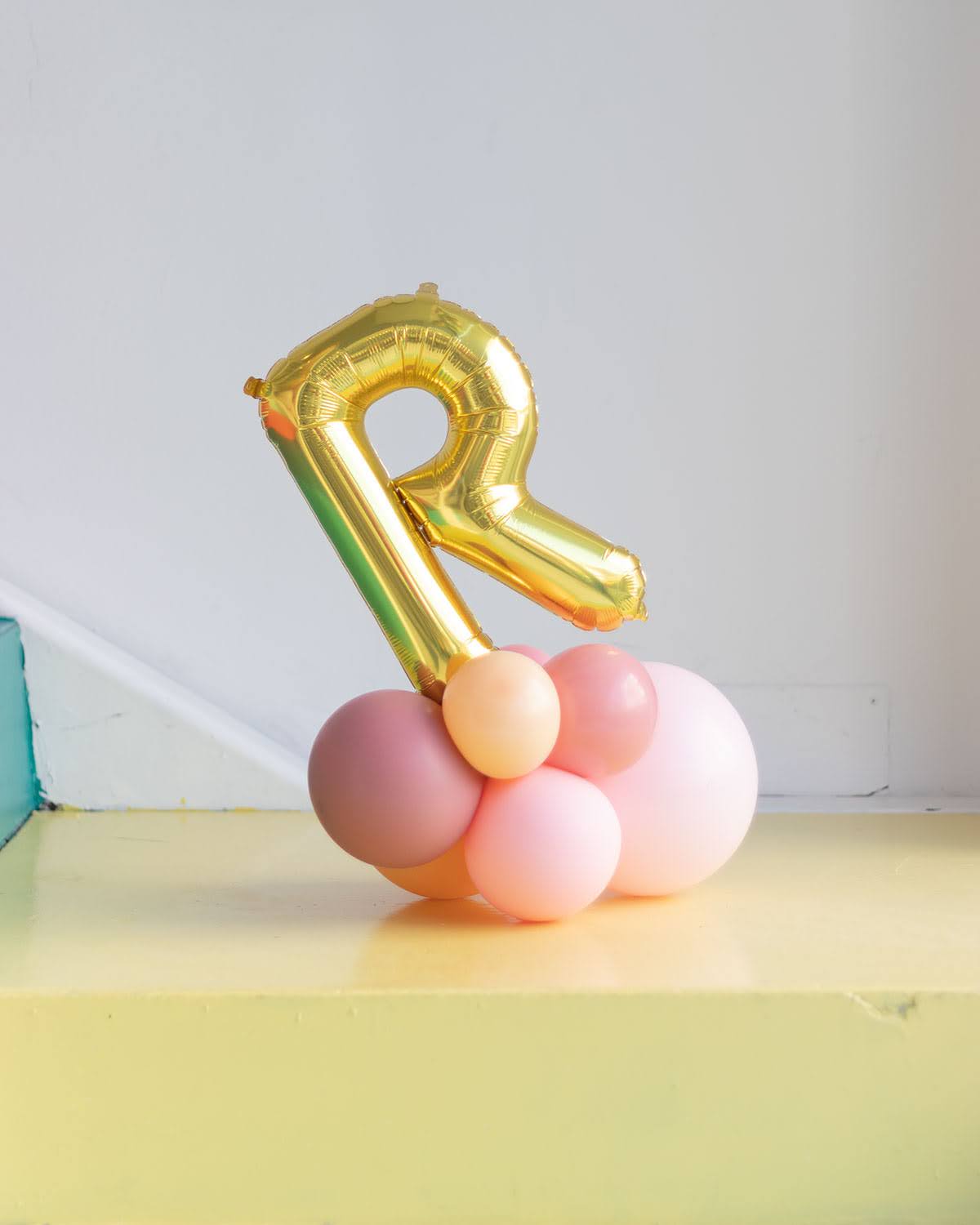 Bonito centro de mesa de globos de látex biodegradable en tonos rosas y crema con un globo de foil metalizado en color oro con forma de la inicial que elijas, todos hinchados con aire. La base mide 30x30cm aproximadamente y 50cm de alto.