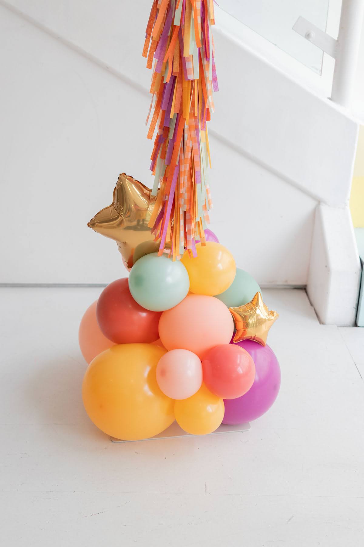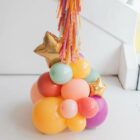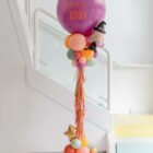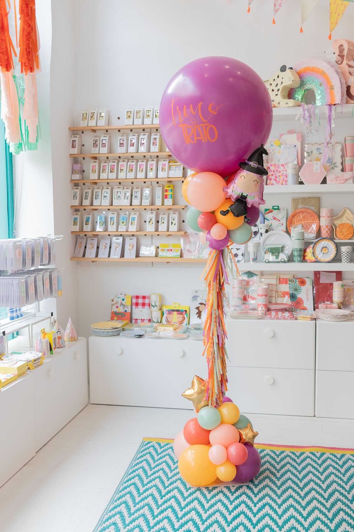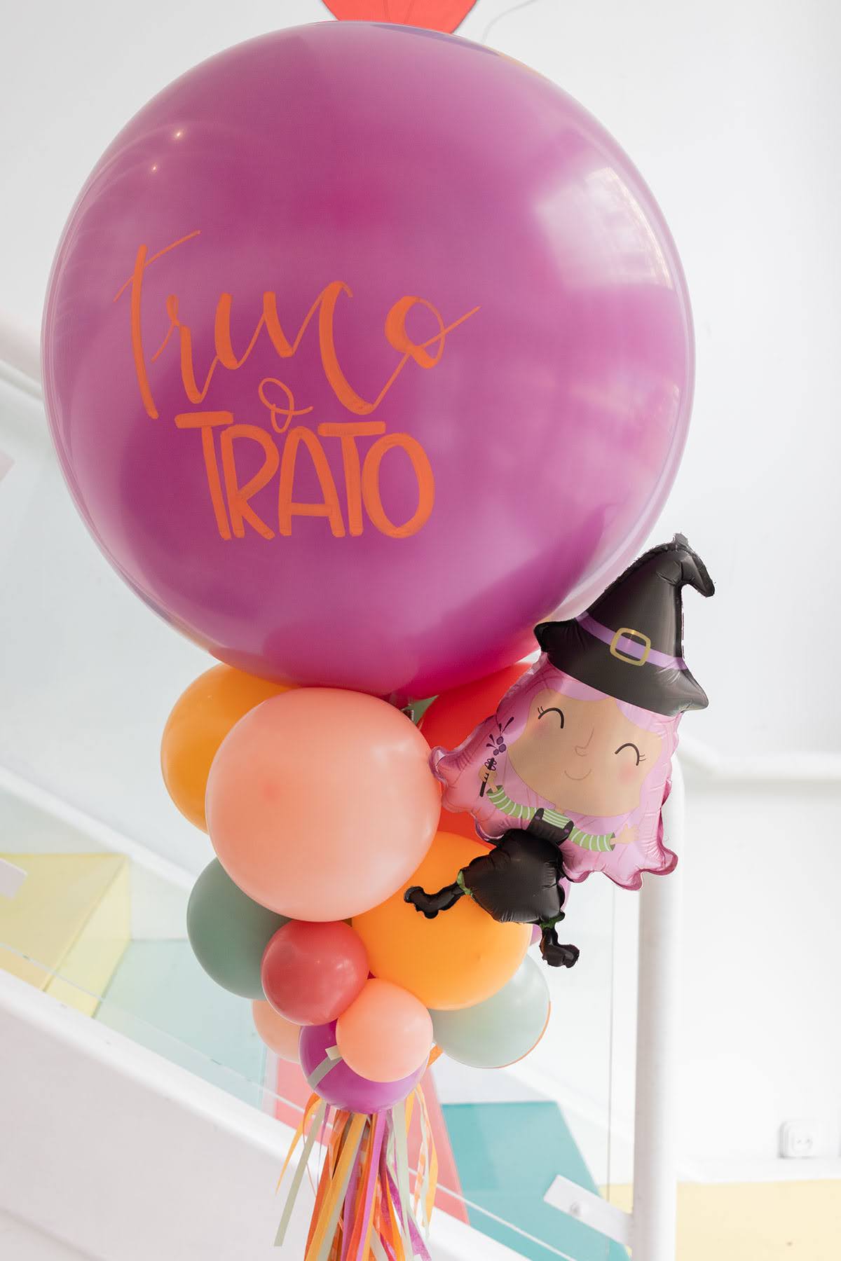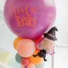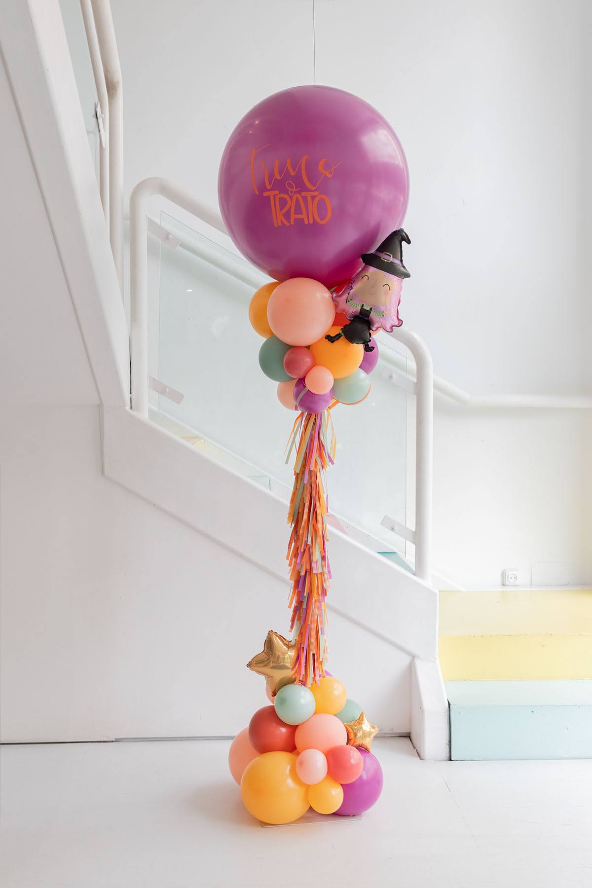 La columna está hecha con globitos de aire y decoradas con figuras pequeñas en forma de brujita y estrella, en el centro lleva unos flecos de papel en los mismo tonos de los globos. En la parte superior lleva un globo de 60cm el cual podrás personalizar con el texto que quieras, así como elegir el color. Mide 2m de alto aproximadamente.