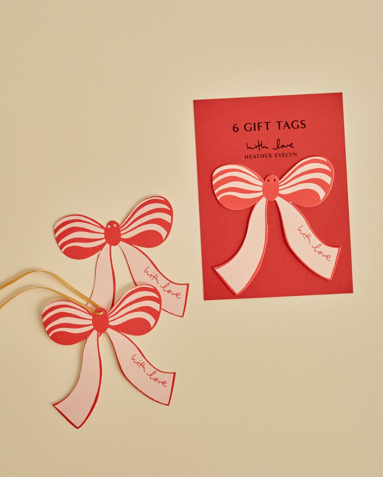 Pack de 8 etiquetas en forma de lazo en 4 diseños. Incluye cordón rojo. Puedes cimbinRlas con nuestro papel de regalo en color metalizado