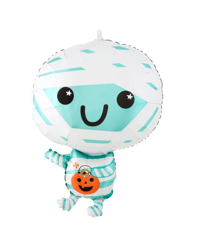 Globo de foil metalizado con forma de momia, mide 55cm y está hinchado con helio.