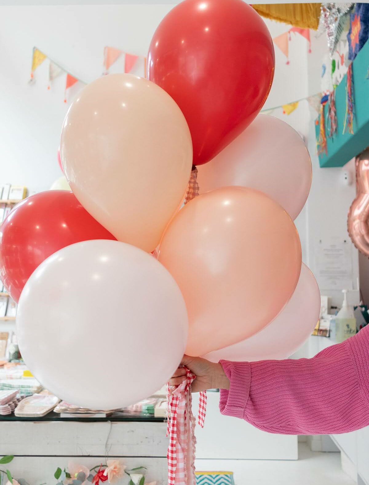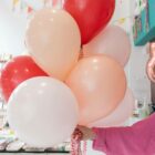 Pack de globos lisos de látex biodegradable de 28cm, hinchados con helio y decorado con un retal de tela vichy. Los colores de la combinación son: Rosa empolvado, melón, melón, rosa pastel, rojo imperial y cameo.