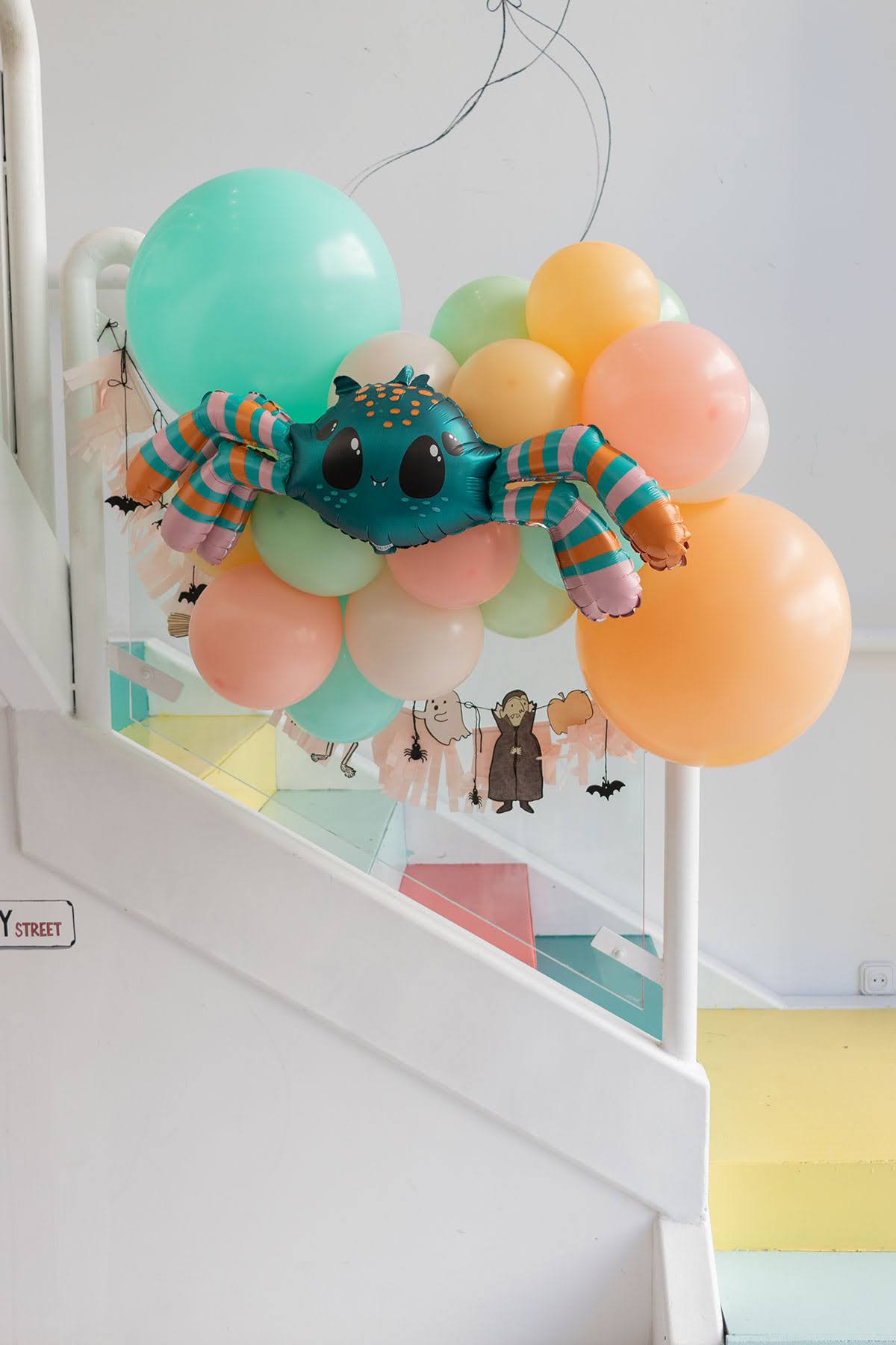 Guirnalda de globos hinchados con aire lista para colocar, lleva unas lazadas para que la puedas atar en vertical, colgar en horizontal, o colocar debajo de la mesa. Incluye un globo de foil en forma de araña de 70cm. Mide 1,5m aproximadamente.