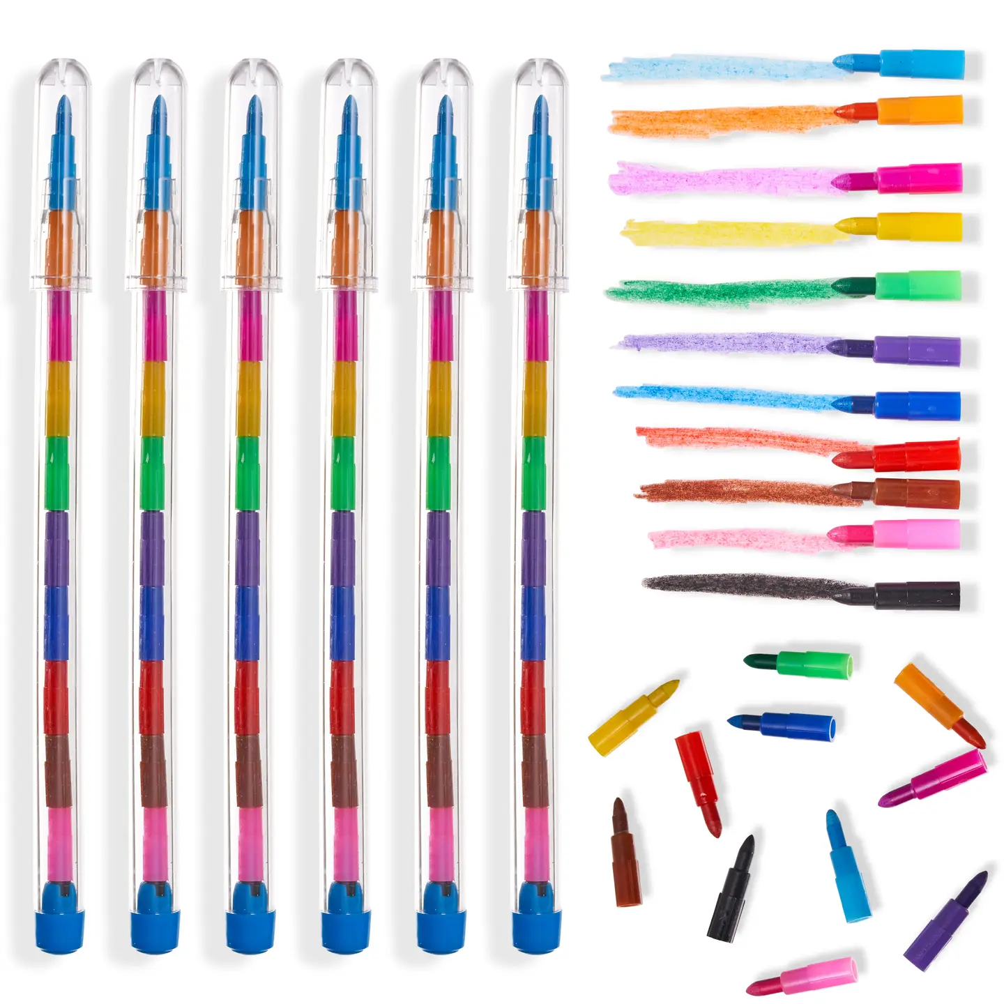 El pack trae 6 unidades, cada crayón contiene 11 puntas de colores diferentes: azul claro, amarillo, rosa, verde, rojo, púrpura, naranja, cereza, azul oscuro y marrón. Mide 14cm.