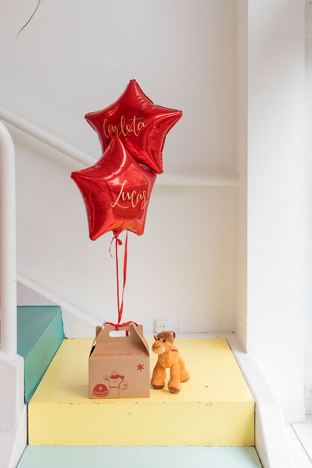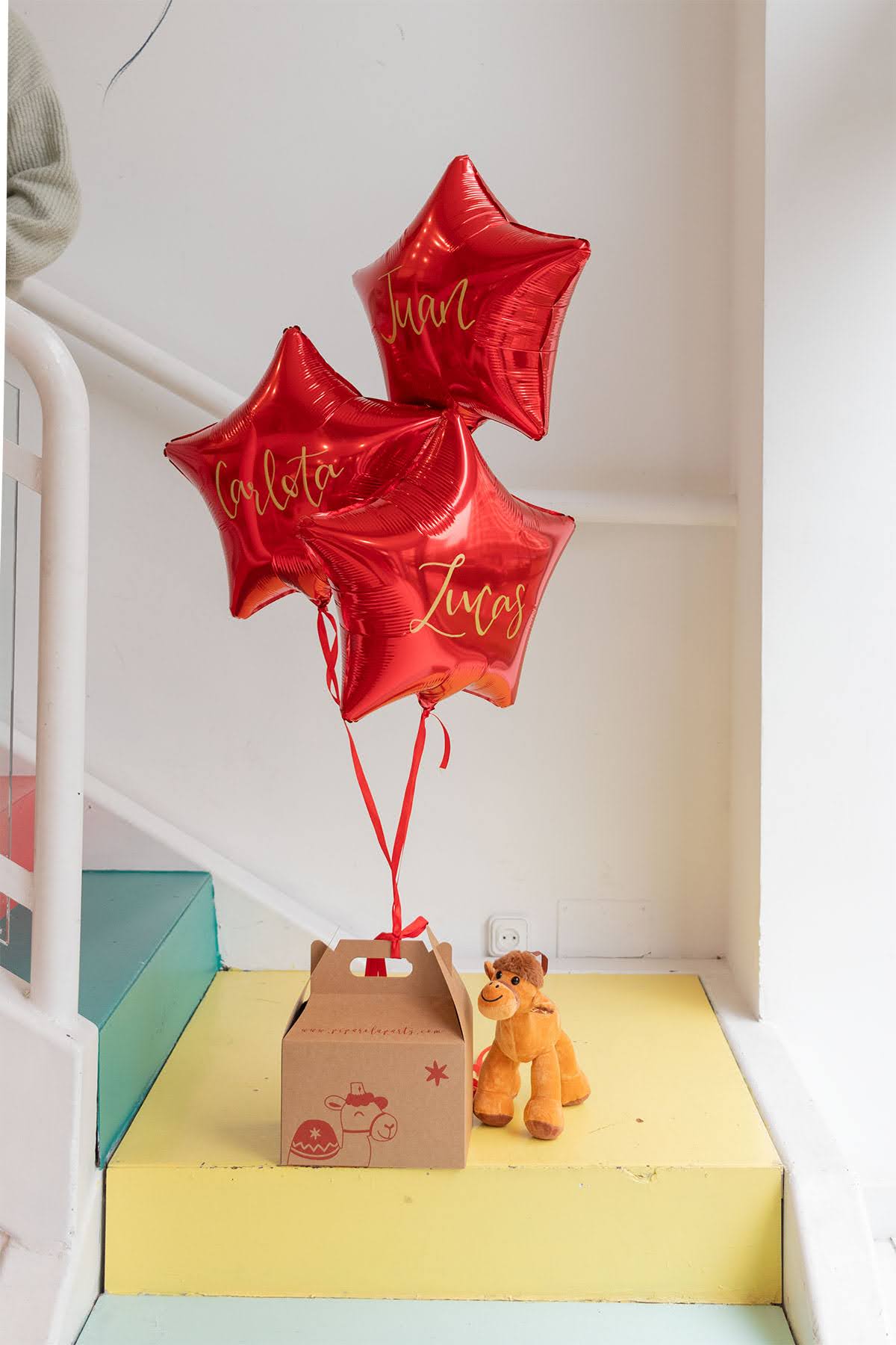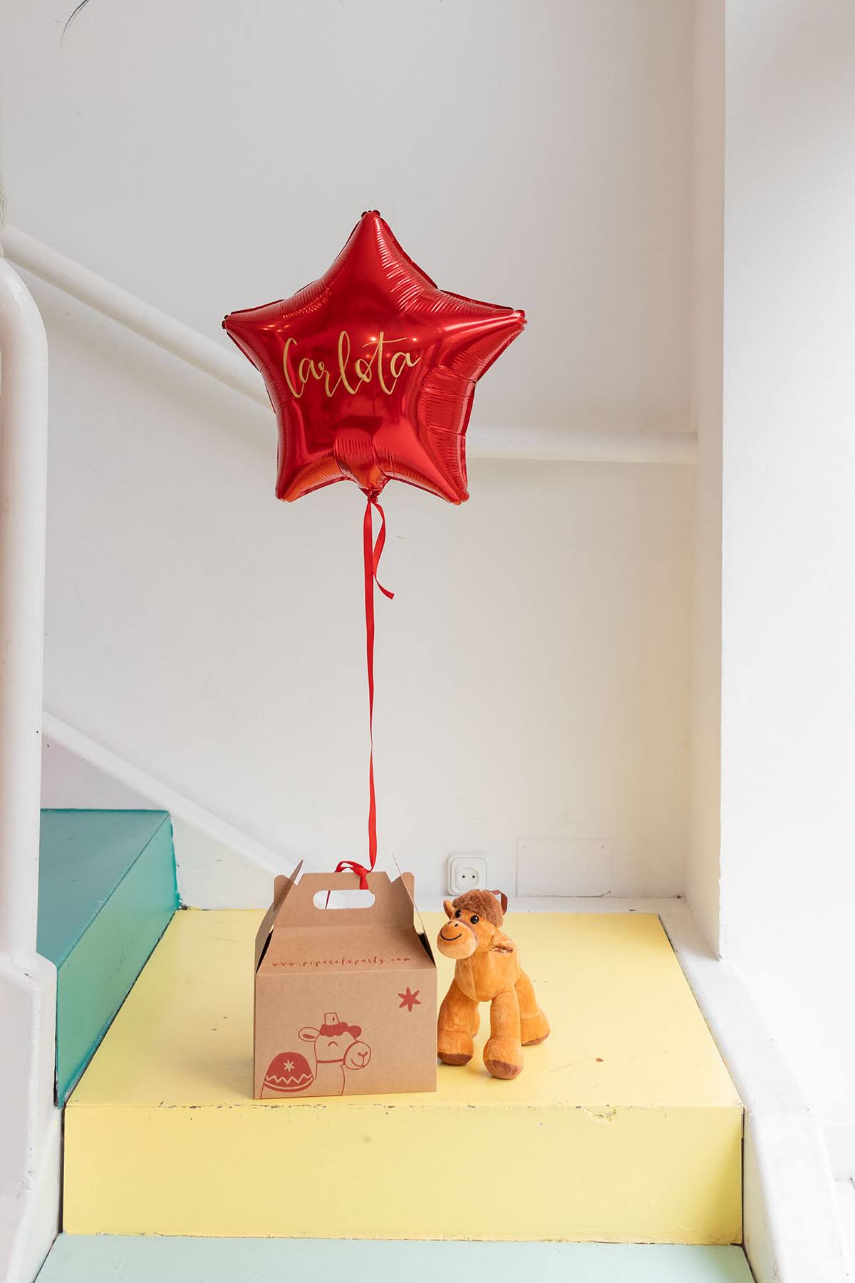 Esta caja llega desde Oriente, enviada por los Reyes Magos, dentro se encuentra Turrón, el camello Real, junto a una carta. Lleva atado un globo en forma de estrella en color rojo. Podrás escoger la cantidad de estrellas y personalizar cada una con un nombre.