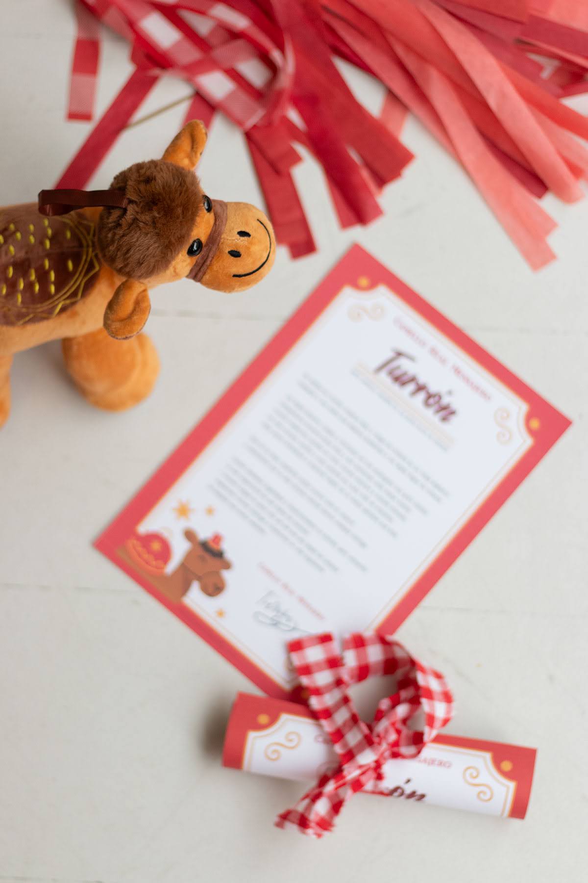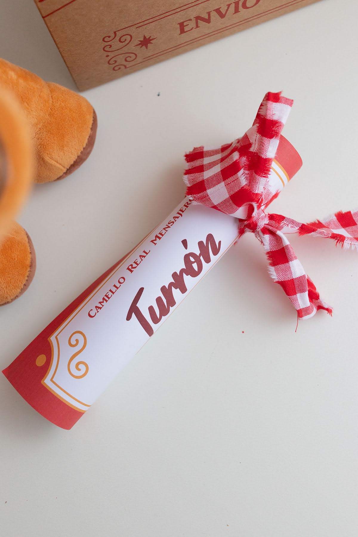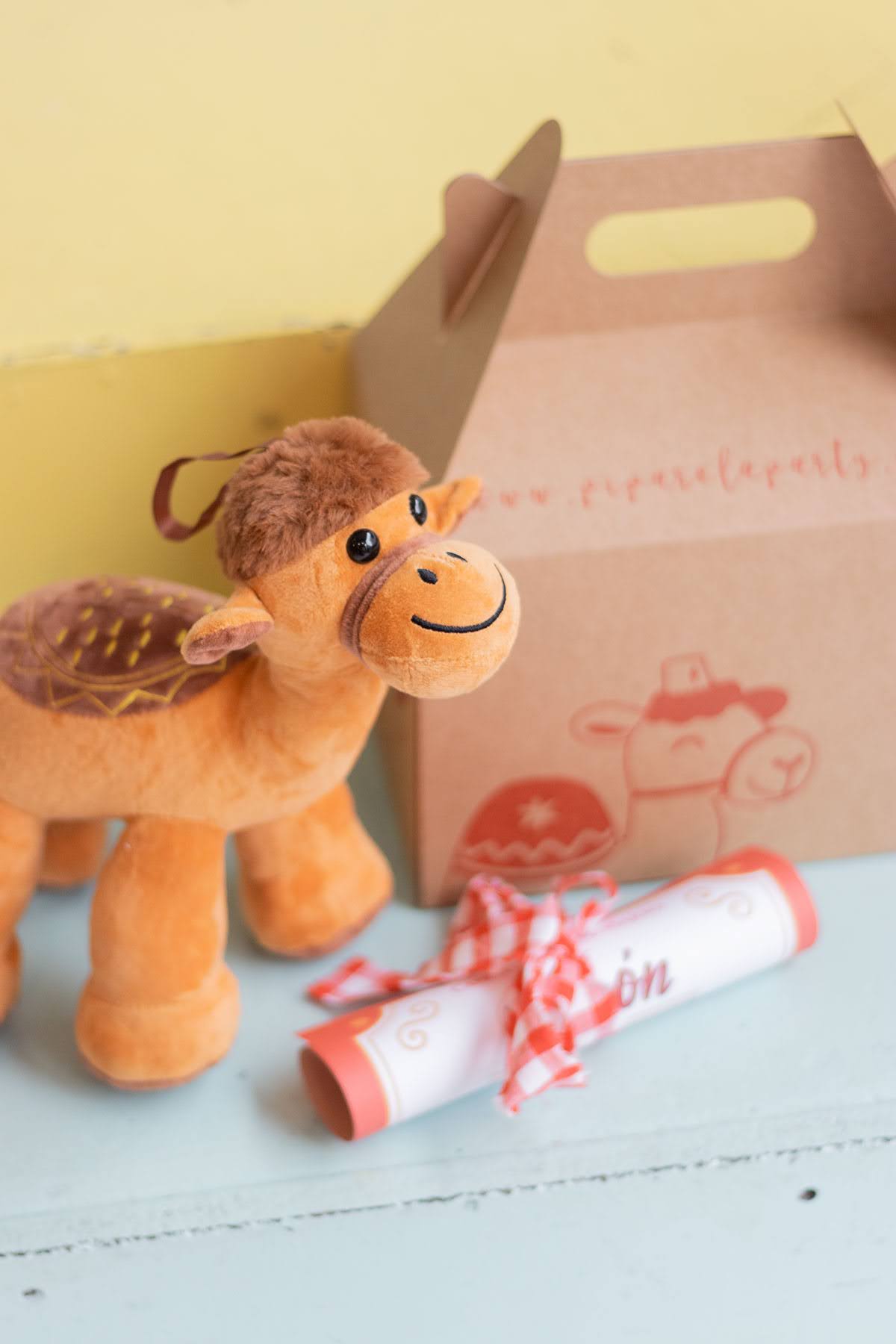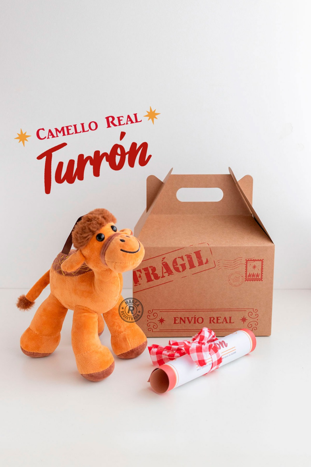 Esta caja llega desde Oriente, enviada por los Reyes Magos, dentro se encuentra Turrón, el camello Real, junto a una carta. Lleva atado un globo en forma de estrella en color rojo. Podrás escoger la cantidad de estrellas y personalizar cada una con un nombre.