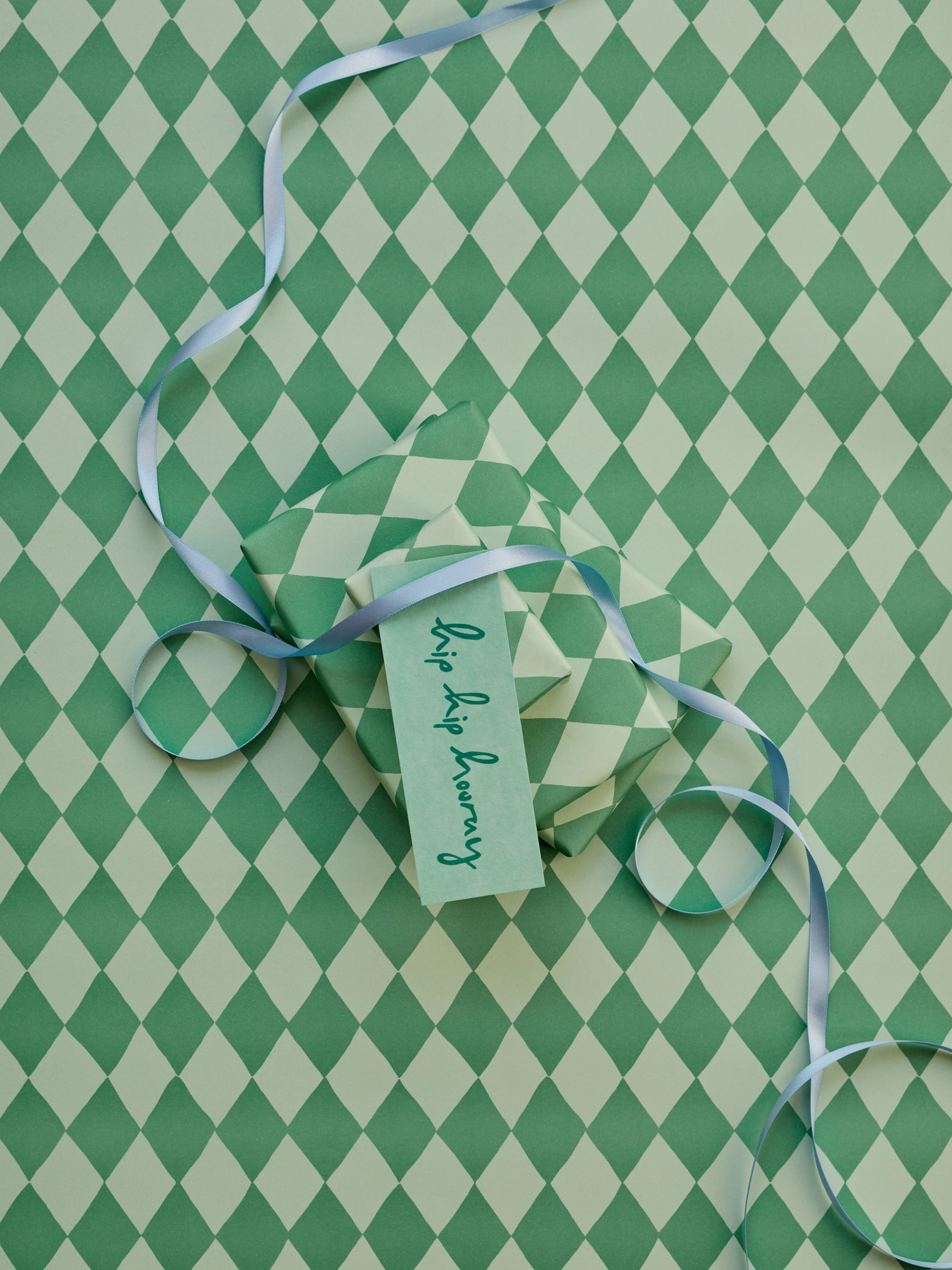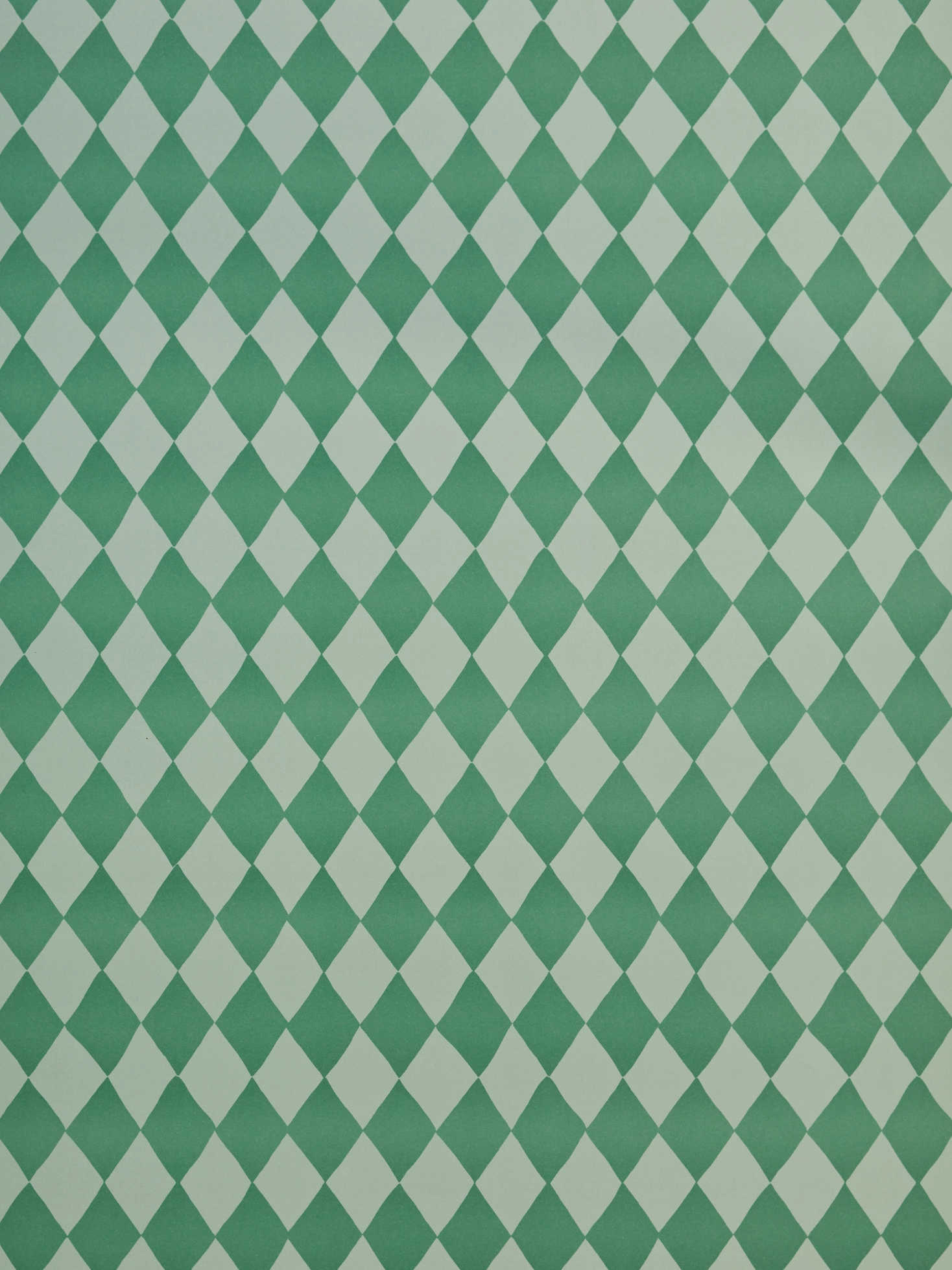 Pliego de papel de envolver estampado con un diseño geométrico repetido en verde, mide 70cm x 49cm.