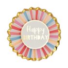 Divertido pin, con el texto “Happy birthday”, hecho de cartón duro. Mide 12cm de diámetro.