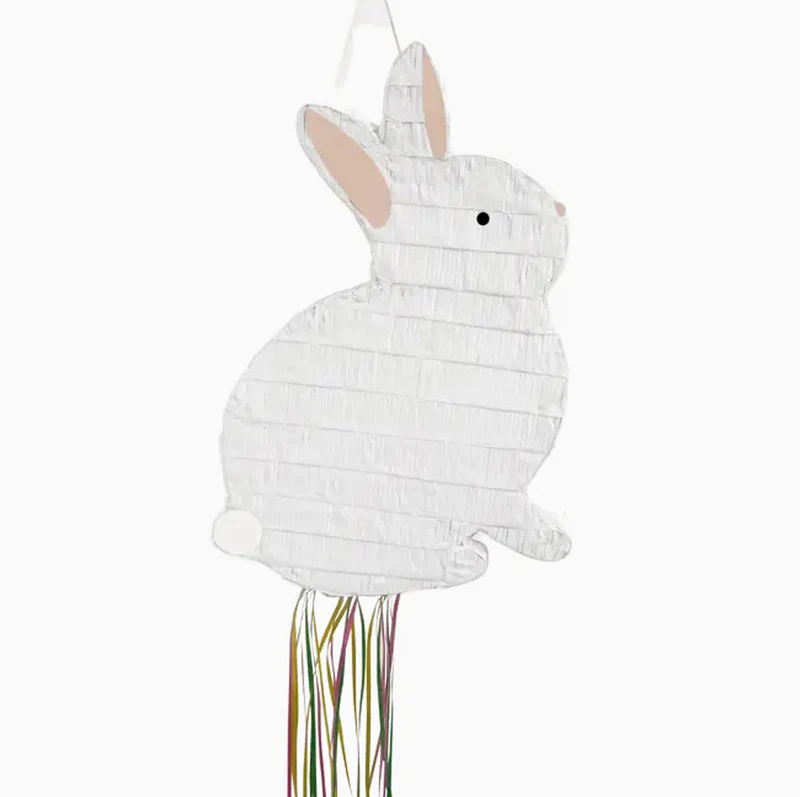 Piñata con forma de conejo que está hecha con papel seda y cartón. Mide aproximadamente 36 x 9.5 x 45 cm. Viene con tiras de colores decorativas.