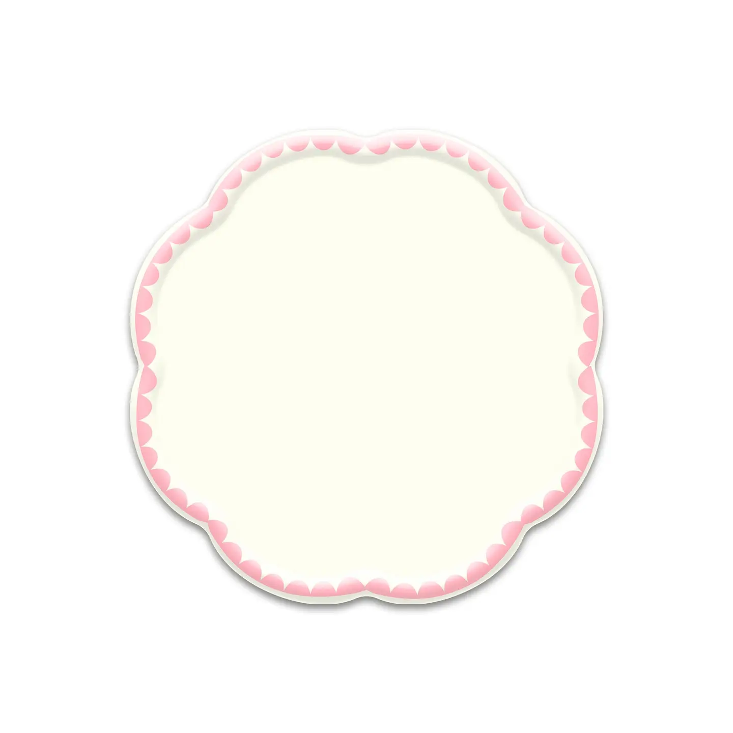 Pack de 8 platos en color blanco con el borde festoneado y detalles en rosa miden 20cm.
