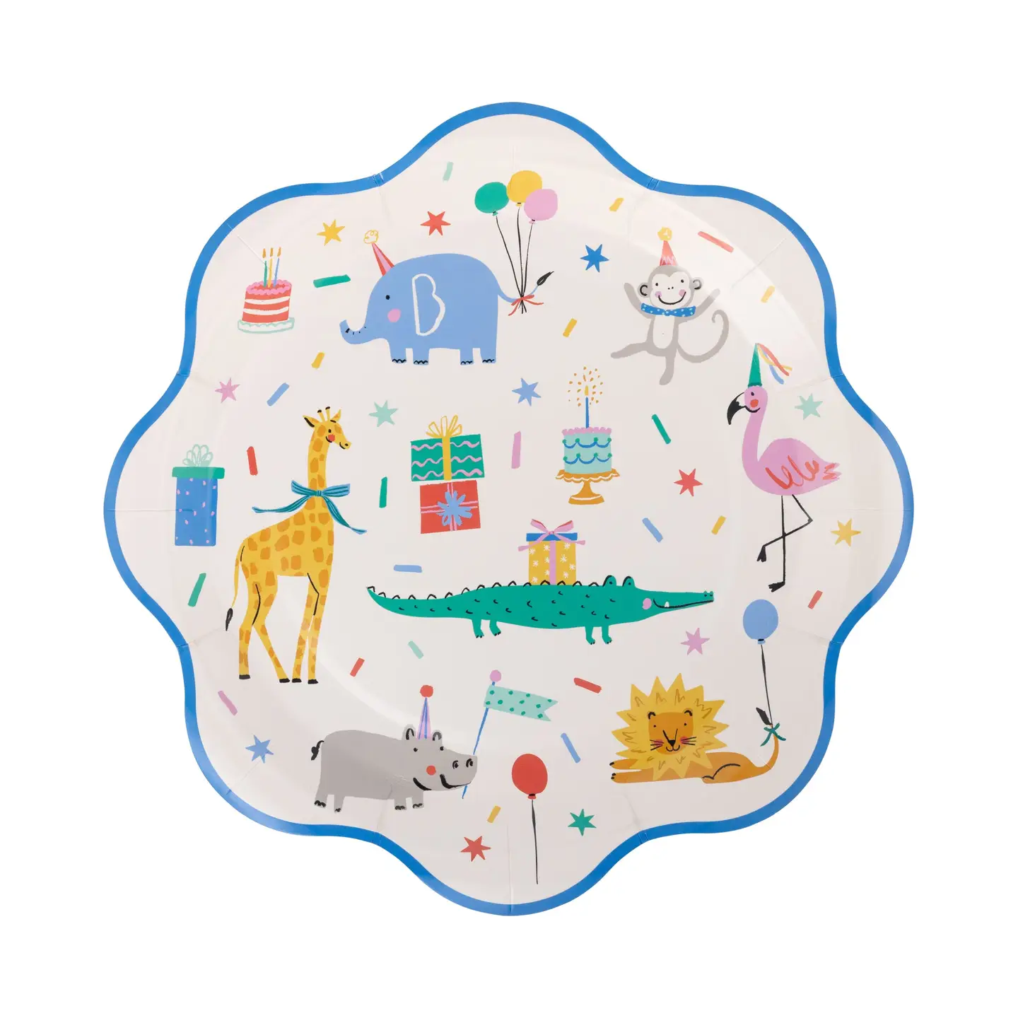Pack de 8 platos estampado con animales de la selva, con el borde festoneado en color azul. Miden 22cm de diámetro