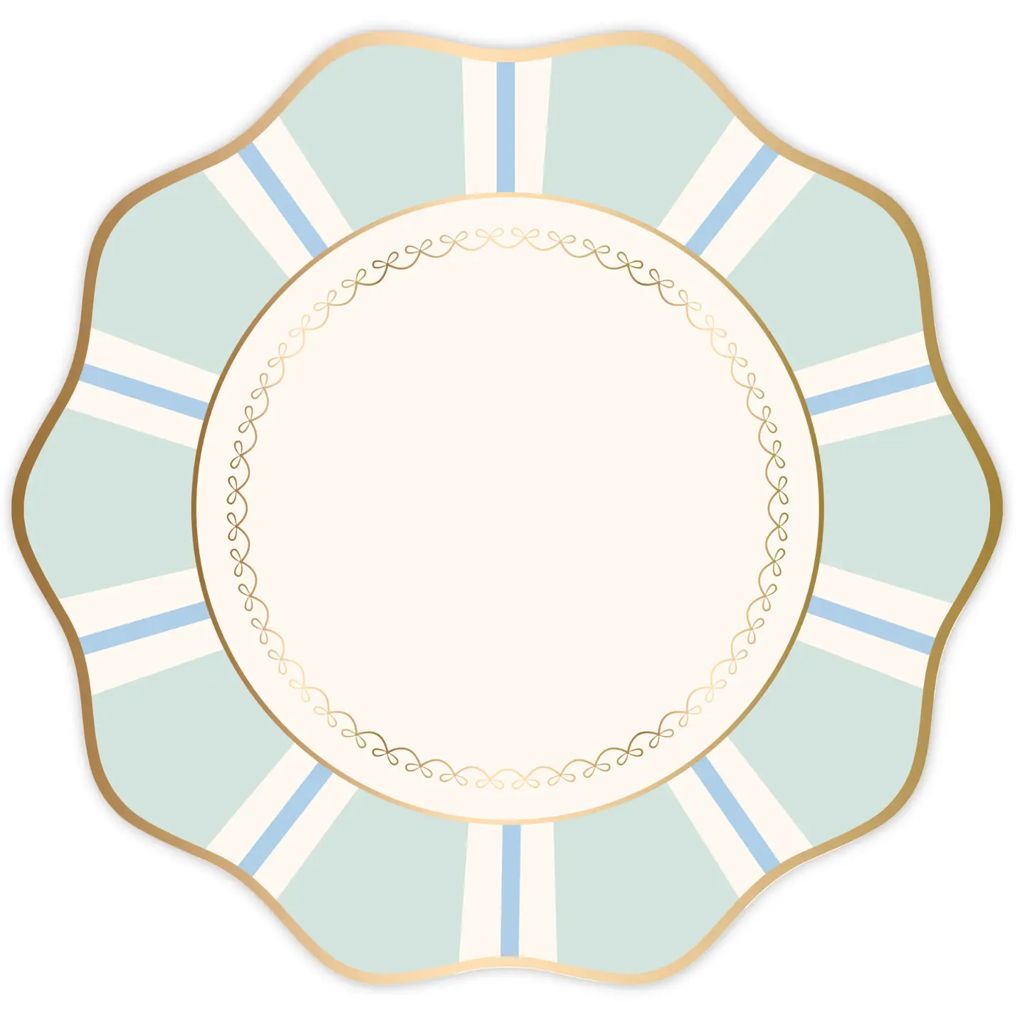 Añade un toque de elegancia a tu fiesta con estos platos! Pack de 8 platos con detalles dorados, trae en borde ondulado a rayas en azul y blanco. Miden 28cm de diámetro.