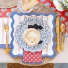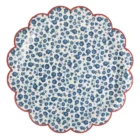 Pack de 8 platos con estampado de flores en tonos azules sobre fondo blanco, con el borde festoneado en color rojo, miden 23cm de diámetro.