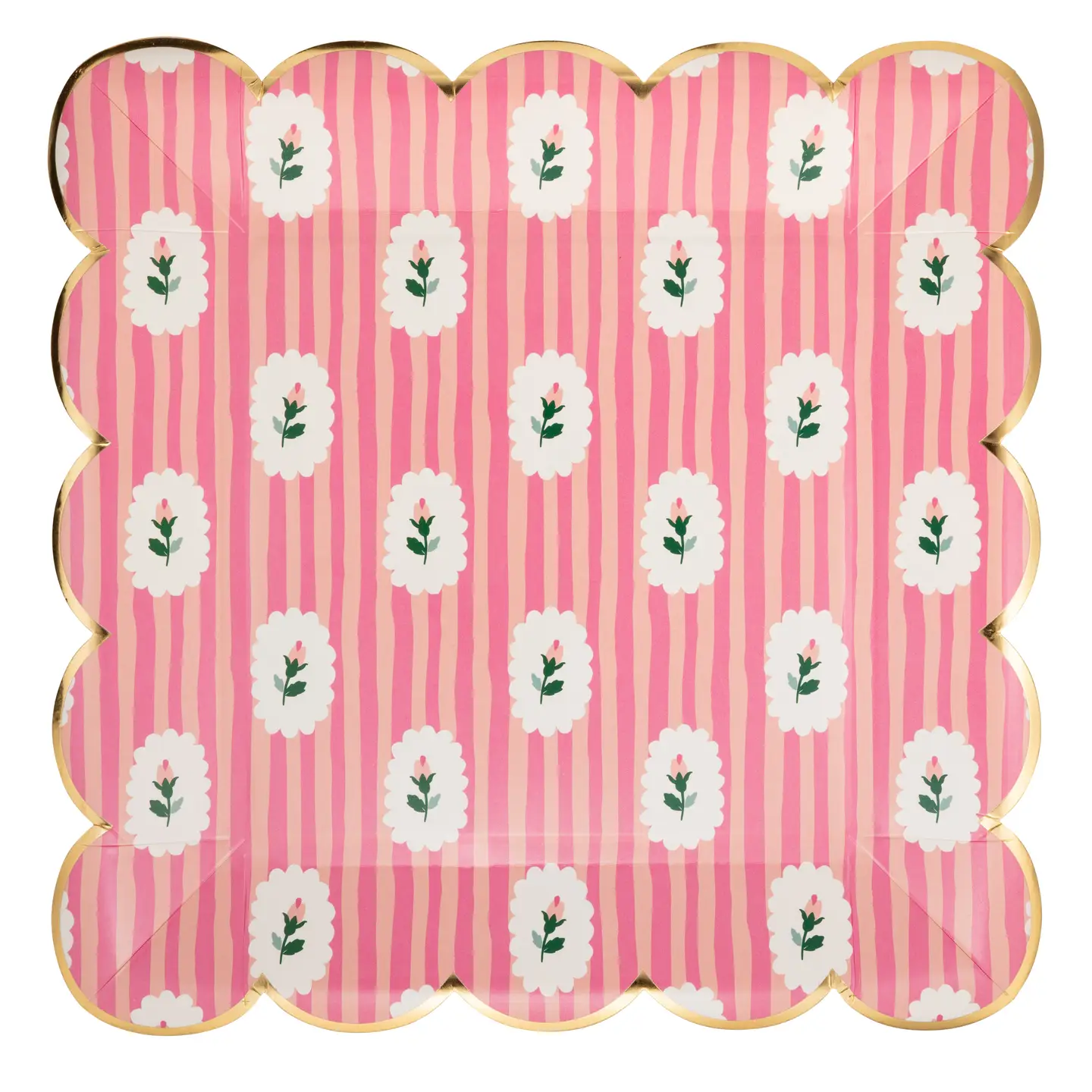 Pack de 8 platos cuadrados estampado con flores sobre fondo con rayas en tonos rosas, con el borde festoneado en oro. Mide 25x25cm