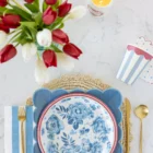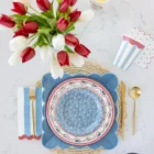 Pack de 8 platos con estampado de flores en tonos azul sobre fondo blanco, con el borde en líneas de color rojo, miden 25cm de diámetro.