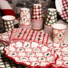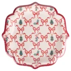 Pack de 15 platos con estampado de lazos y adornos navideños, tiene el borde ondulado en color rojo. Miden 23cm