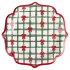 Pack de 15 platos con diseño vichy en verde, con lazos como detalles, tiene el borde ondulado en color rojo. Miden 22cm