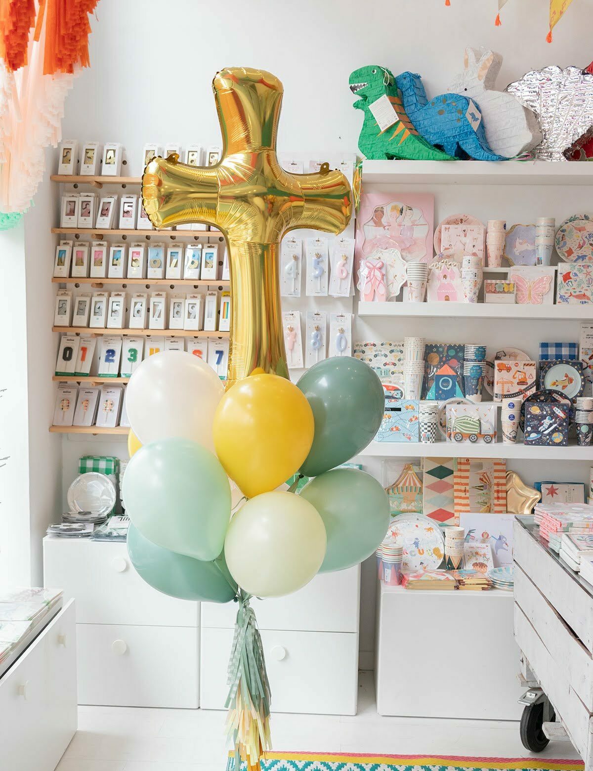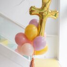 Ramo compuesto por un globo de foil metalizado de 80cm con forma de cruz en dorado, 10 globos de látex de 28cm en tonos multi, según la combinación que elijas. Todos van atados con flecos de papel y sujetos al peso que elijas