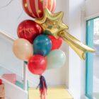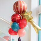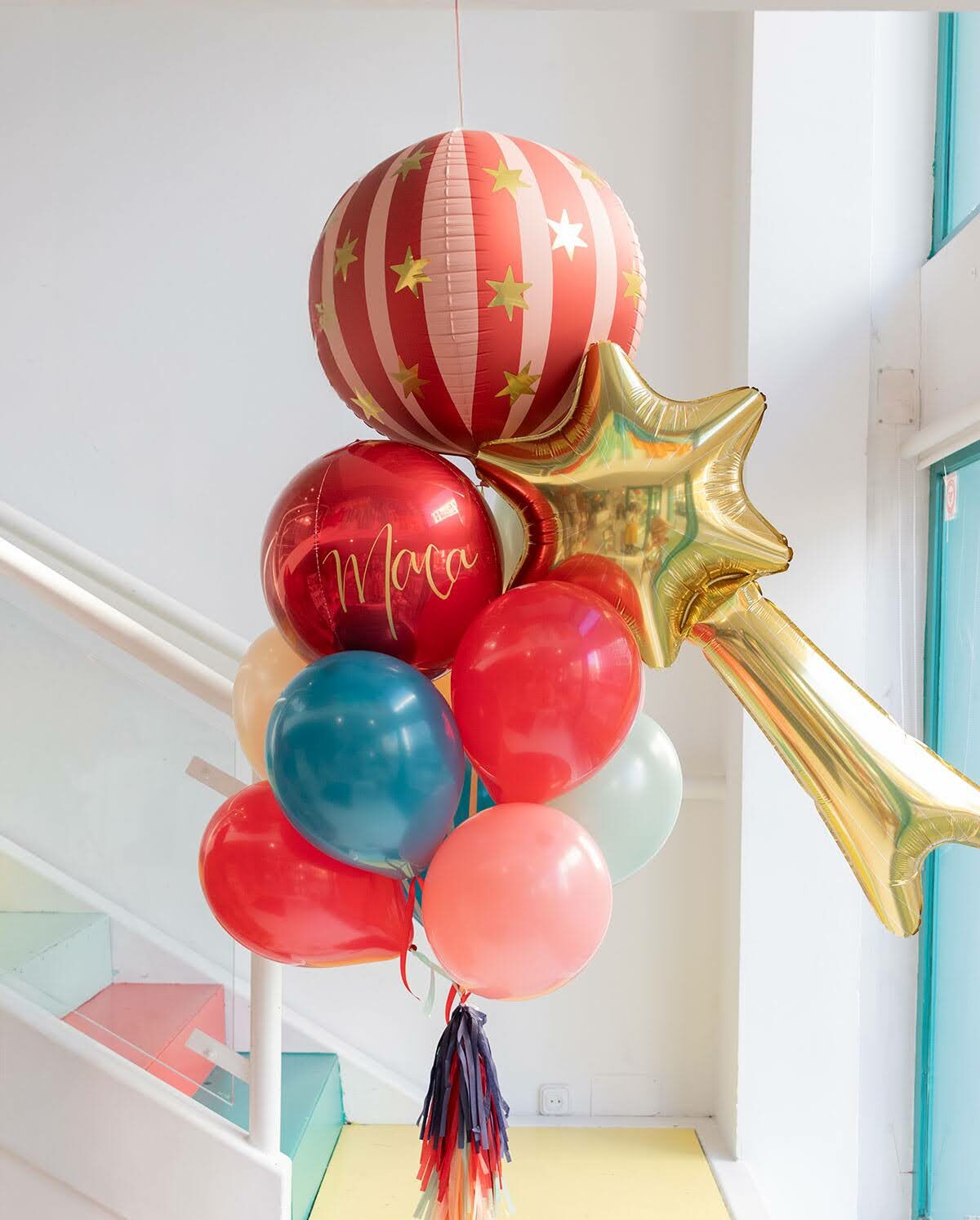 Un ramo lleno de magia real! Una gran bola a rayas con estampado de estrellitas doradas, 1 globo de foil en forma de estrella fugaz ,un globo redondo de 40cm don podemos escribir un nombre y 10 globos de látex, todos sujetos por unos flecos de papel y atados a un tarrito de chuches.