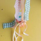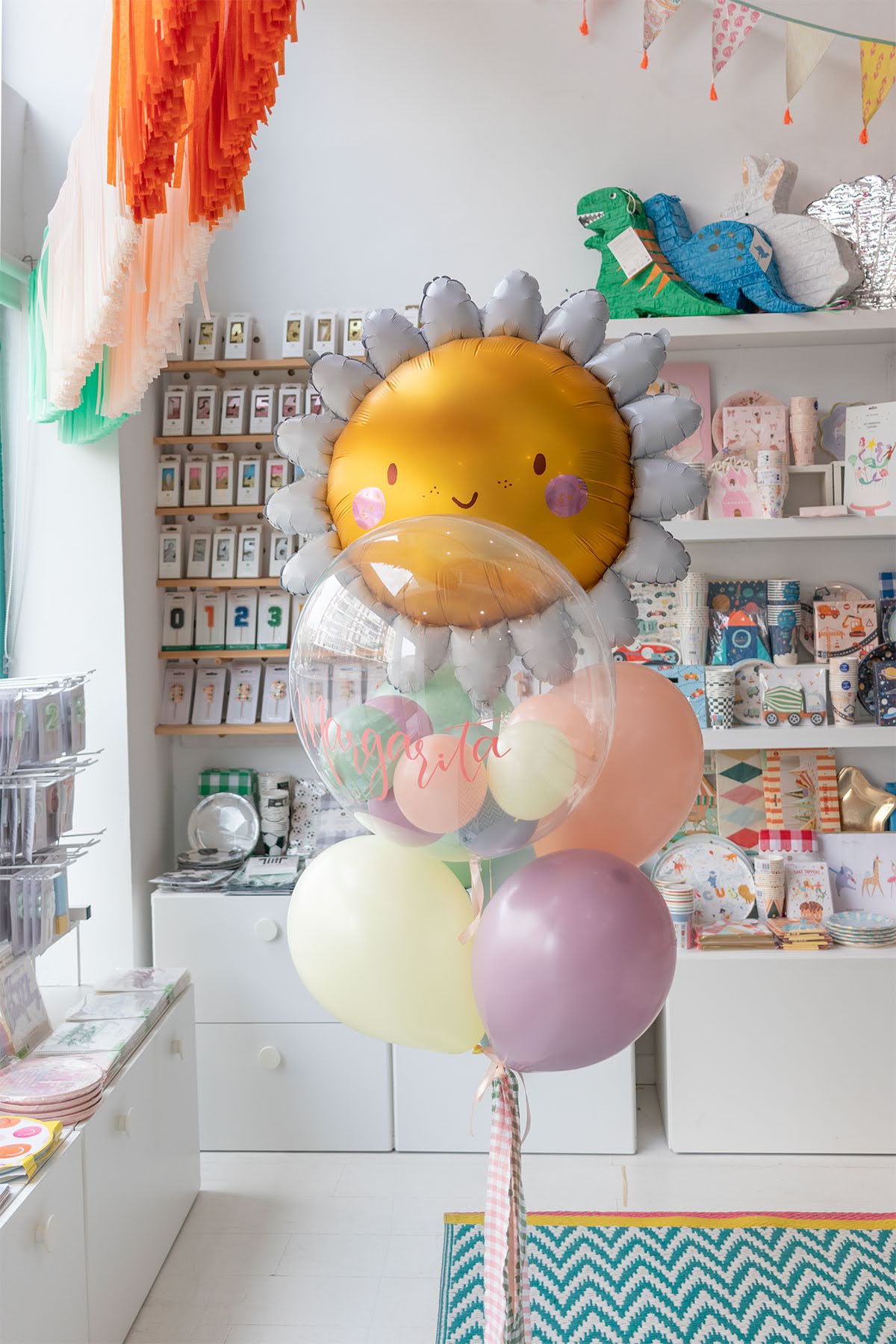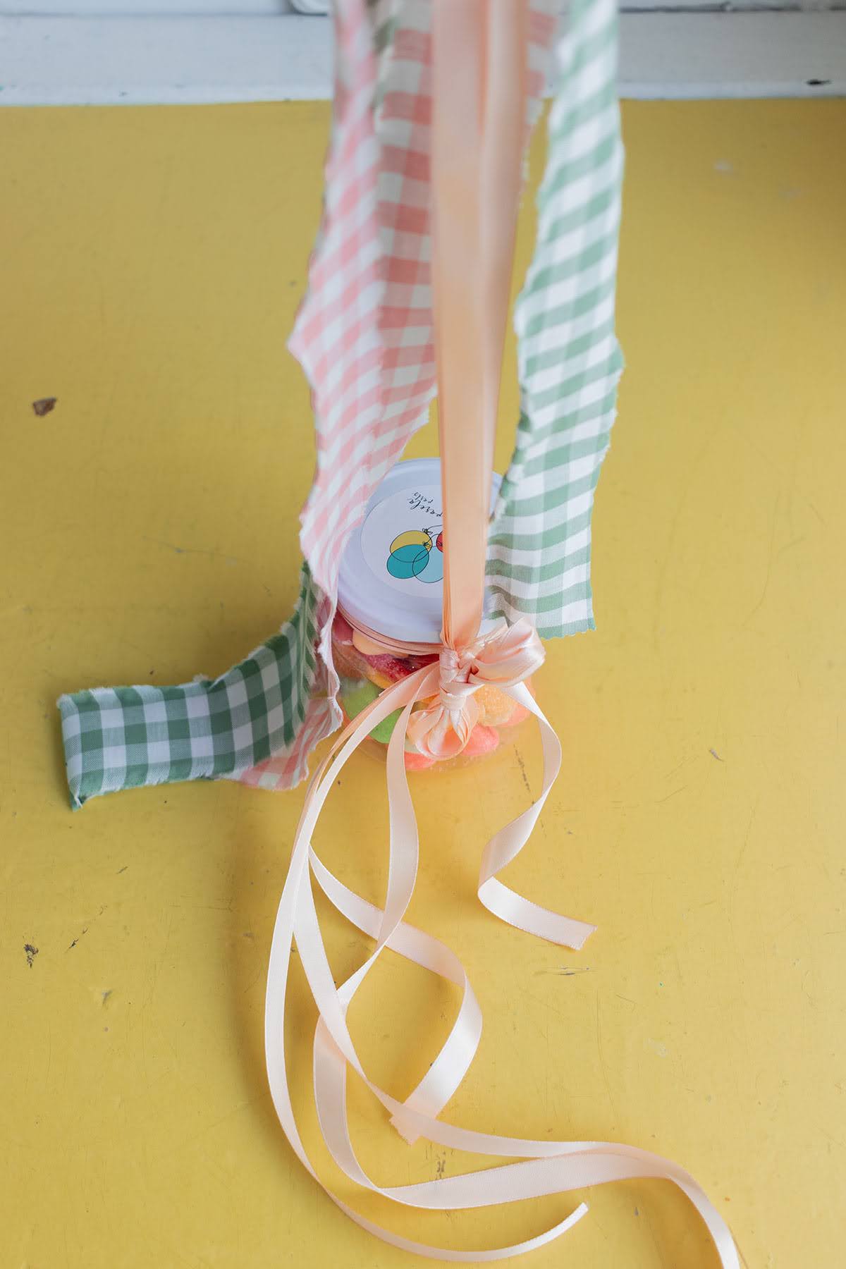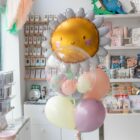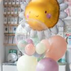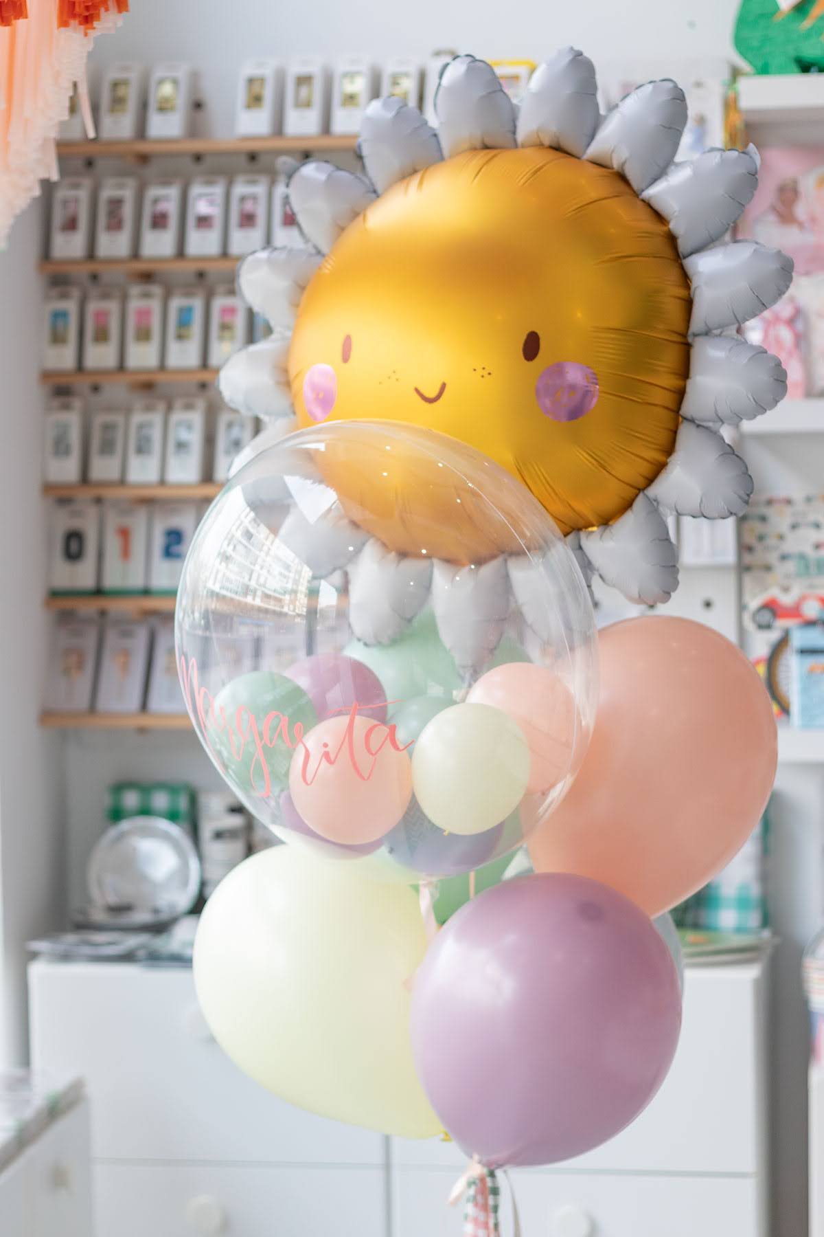 Ramo de globos hinchado con helio, formado por un globo en forma de margarita, 1 globo burbuja con globitos en el interior y 5 globos de látex de 28cm, decorado con retales de tela yatados a un tarrito de chuches.