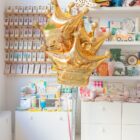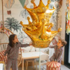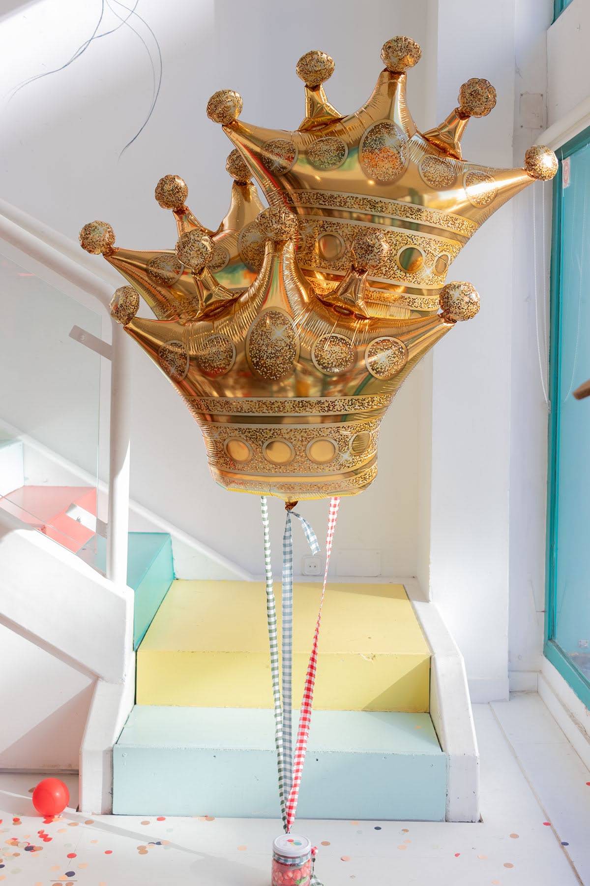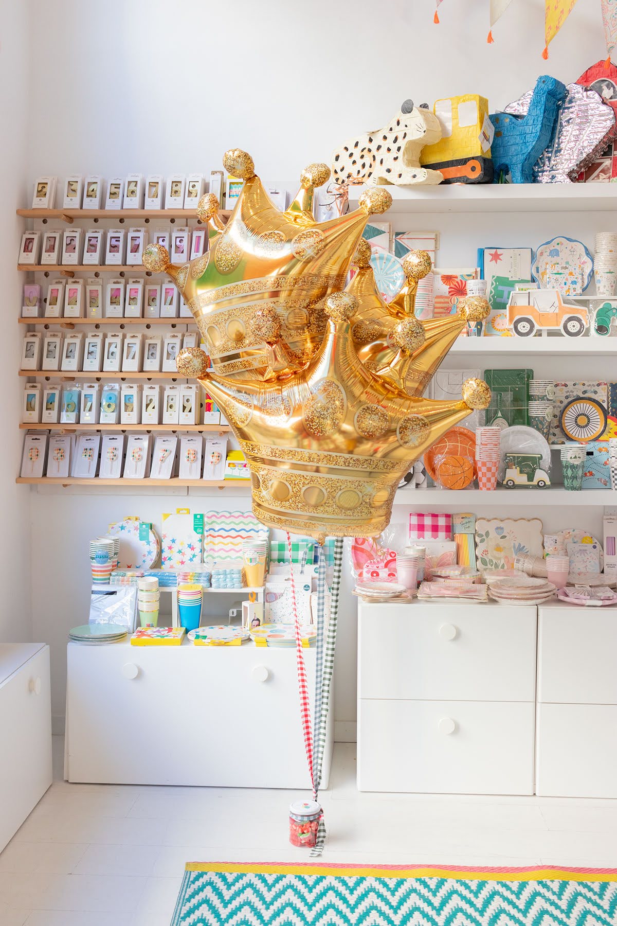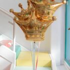 Este ramo incluye 3 globos de foil metalizado con forma de corona dorada de 100cm de la marca Qualatex hinchados con helio, cada uno con retal vichy. Van atadas a un tarrito de chuches.