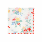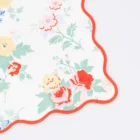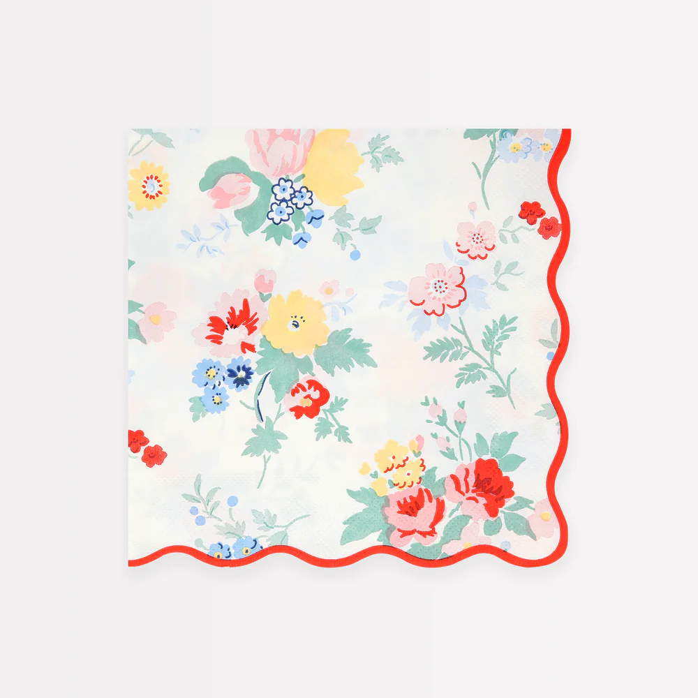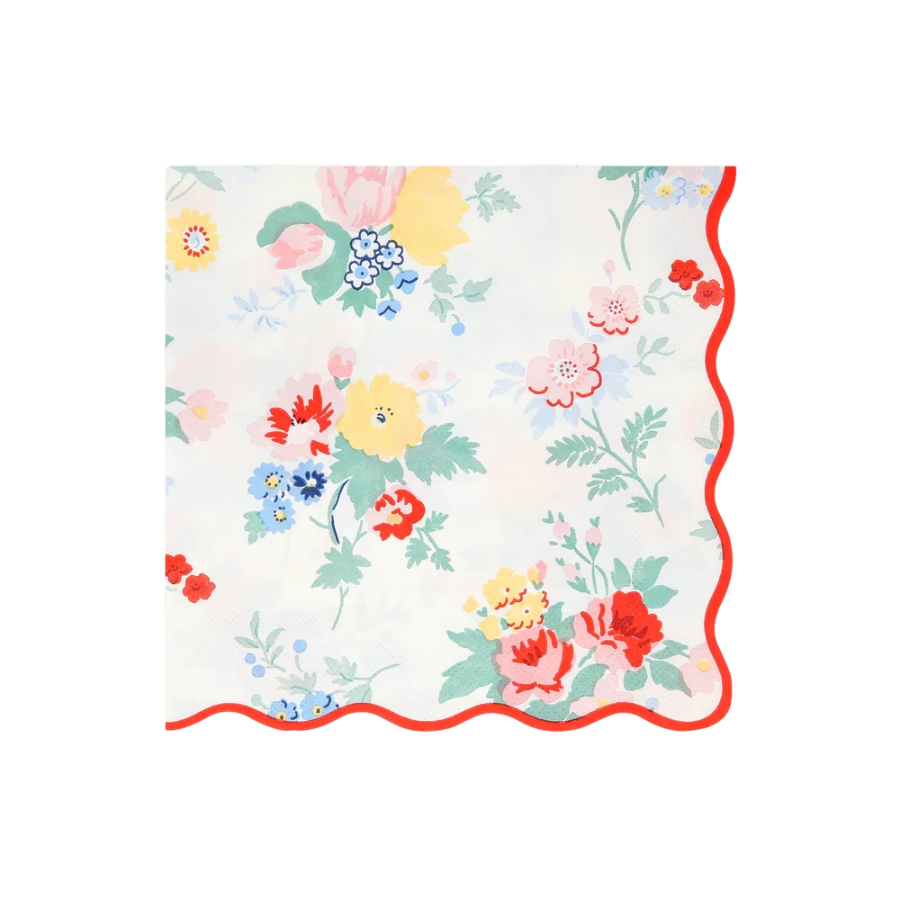 Pack de 16 servilletas estampadas con flores, trae el borde ondulado en color rojo. Mide plegado 16,5cm