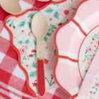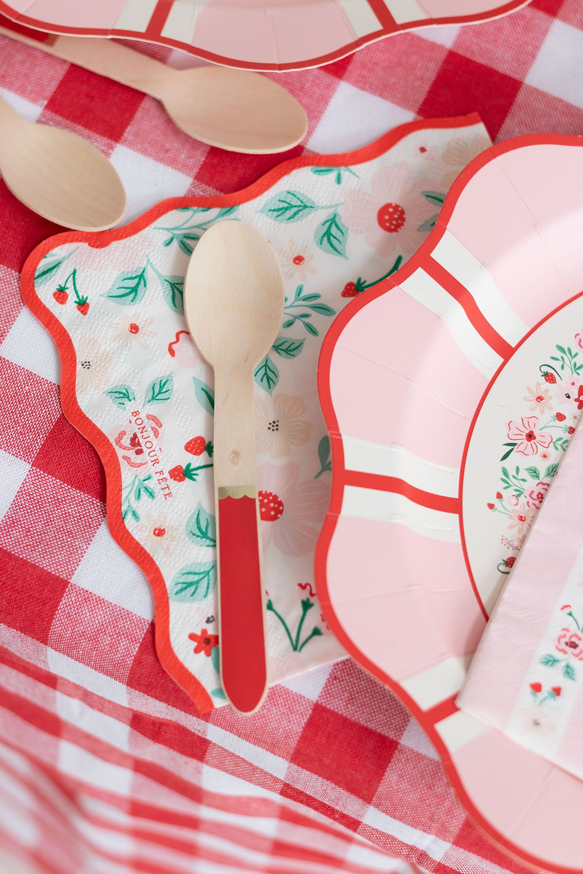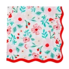 Pack de 20 servilletas estampadas con flores, trae el borde ondulado en color rojo. Mide plegado 16,5cm