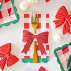 Pack de 18 servilletas con estampado vichy, con el borde festoneado en color verde. Cada servilleta trae una lazada de papel y mide 10×19,5cm