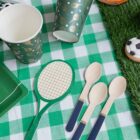 Pack de 18 servilletas en forma de raqueta de tenis, surtido en dos colores: verde y rosa. Miden 8x19cm