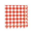 Pack de 16 servilletas con estampado vichy en color rojo y detalles en dorado, con el borde ondulado. Miden 33×33 cm.