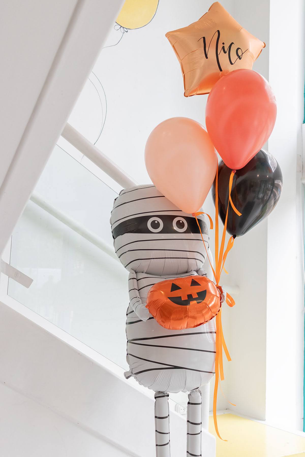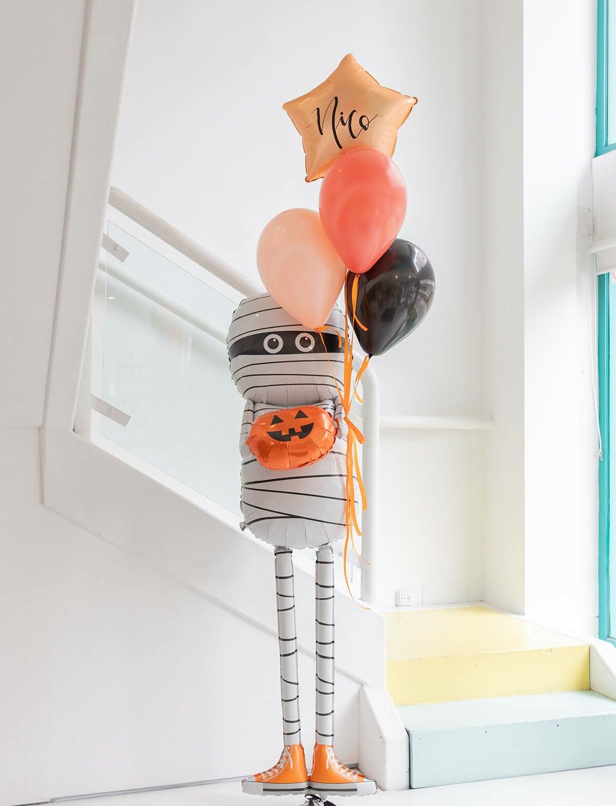 Sorprende a tus invitados con esta Súper momia! Mide 165cm de alto, hinchado con Helio y acompañados de una ramos de 3 látex multicolor, estrella de foil de 40cm, la cual podrás personalizar con un texto corto