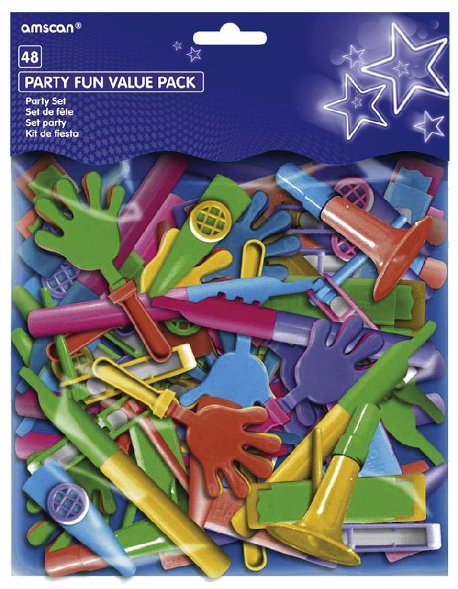 Pack de 48 juguetitos de ruido (carracas, flautas, silbato, mano aplausos…) para meter en la piñata o regalar a los invitados a tu fiesta.