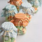 Cada tarrito tiene una capacidad de 500ml, decorados con retales de tela Liberty, rayas, vichy y sujetos con un cordón. Cada tarro lleva un estampado diferente, en caso de pedir más de 6 se duplicarán los estampados, según disponibilidad.