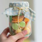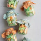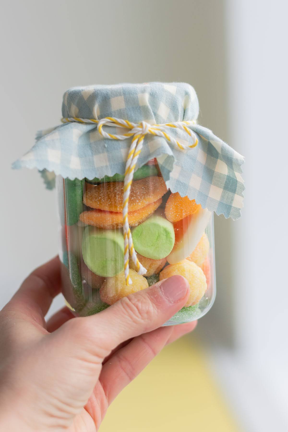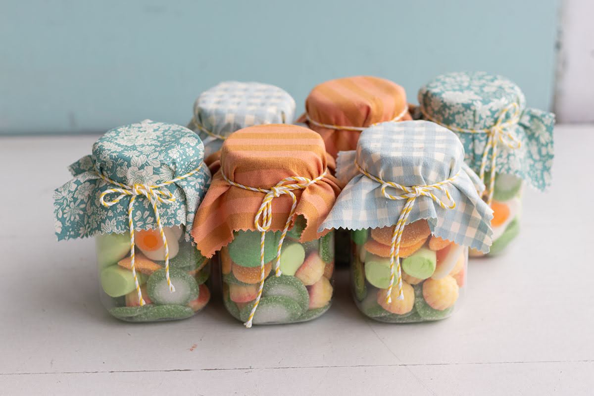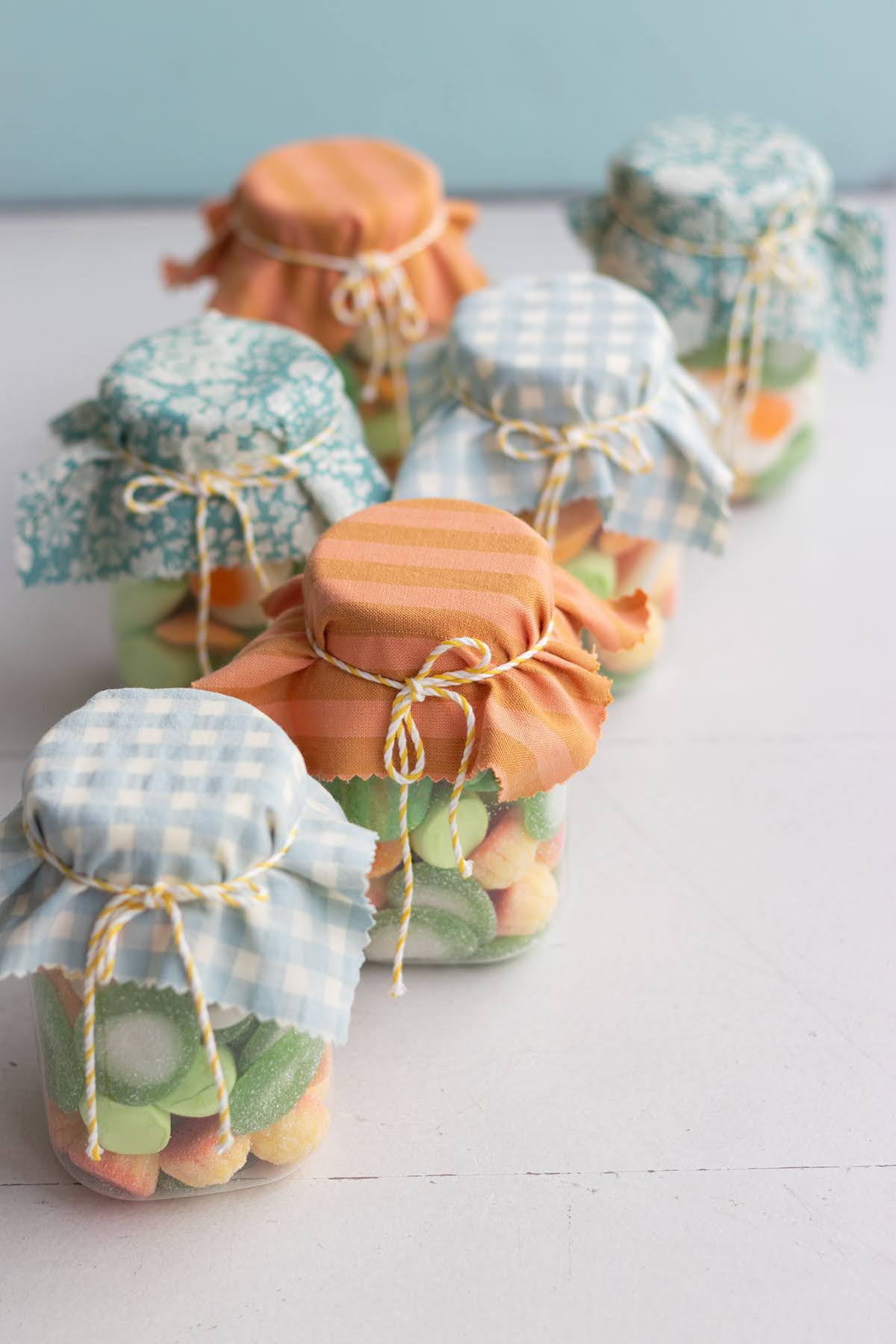 Tarro pvc apto para alimentos, de 500ml de capacidad relleno de chuches y decorado con retal de tela. Podrás elegir la cantidad que más se adapte a tu evento.
