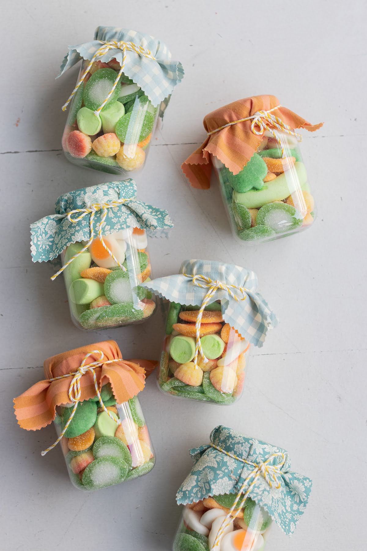 Pack de tarritos rellenos de chuches, perfectos para regalar o decorar mesas dulces en tus celebraciones, bautizos, comuniones, bodas y cumpleaños.