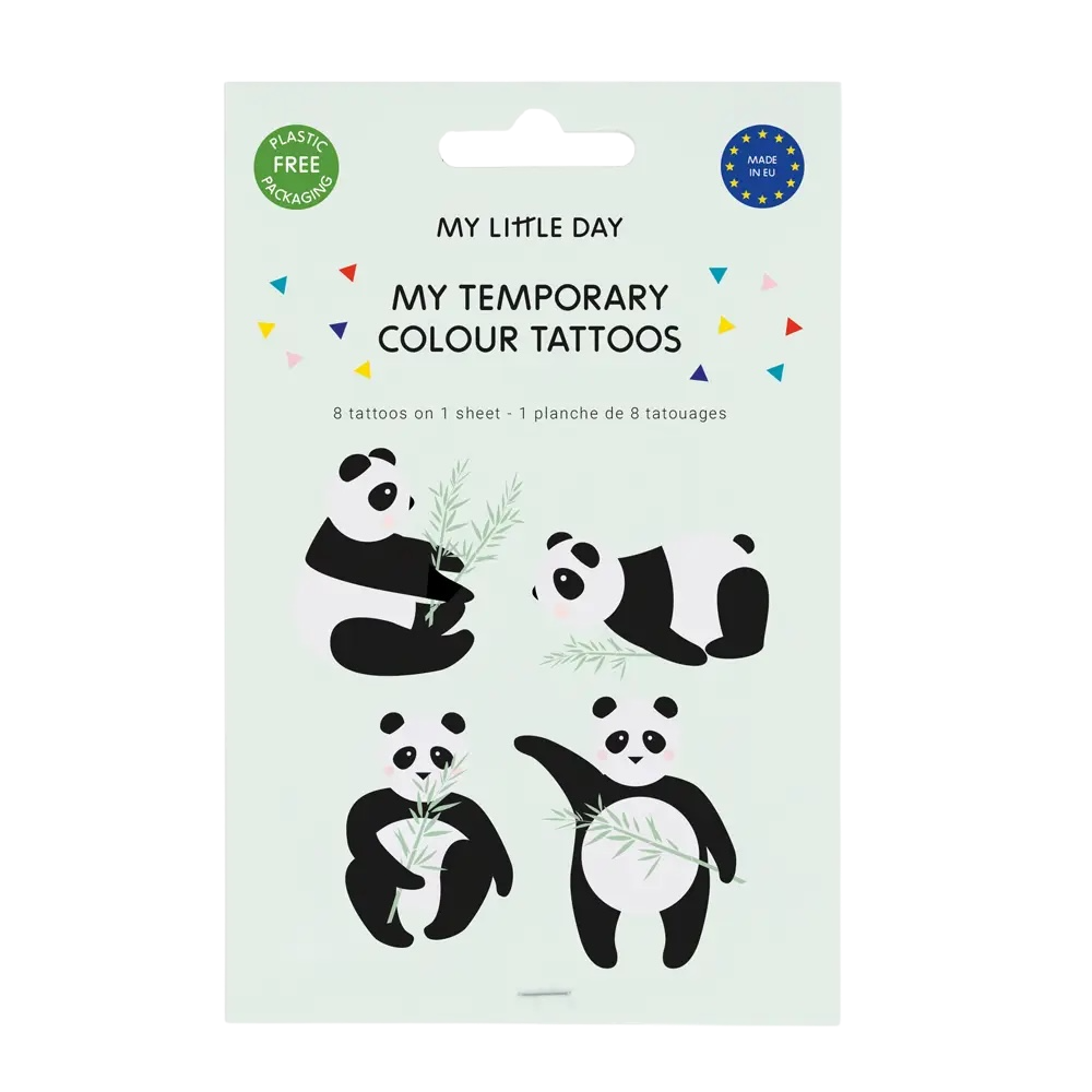 Hoja de 8 tattoos temporales con forma de pandas. Estos tatuajes son perfectos para meter en la bolsas de regalito, piñatas o para dar como detalle.