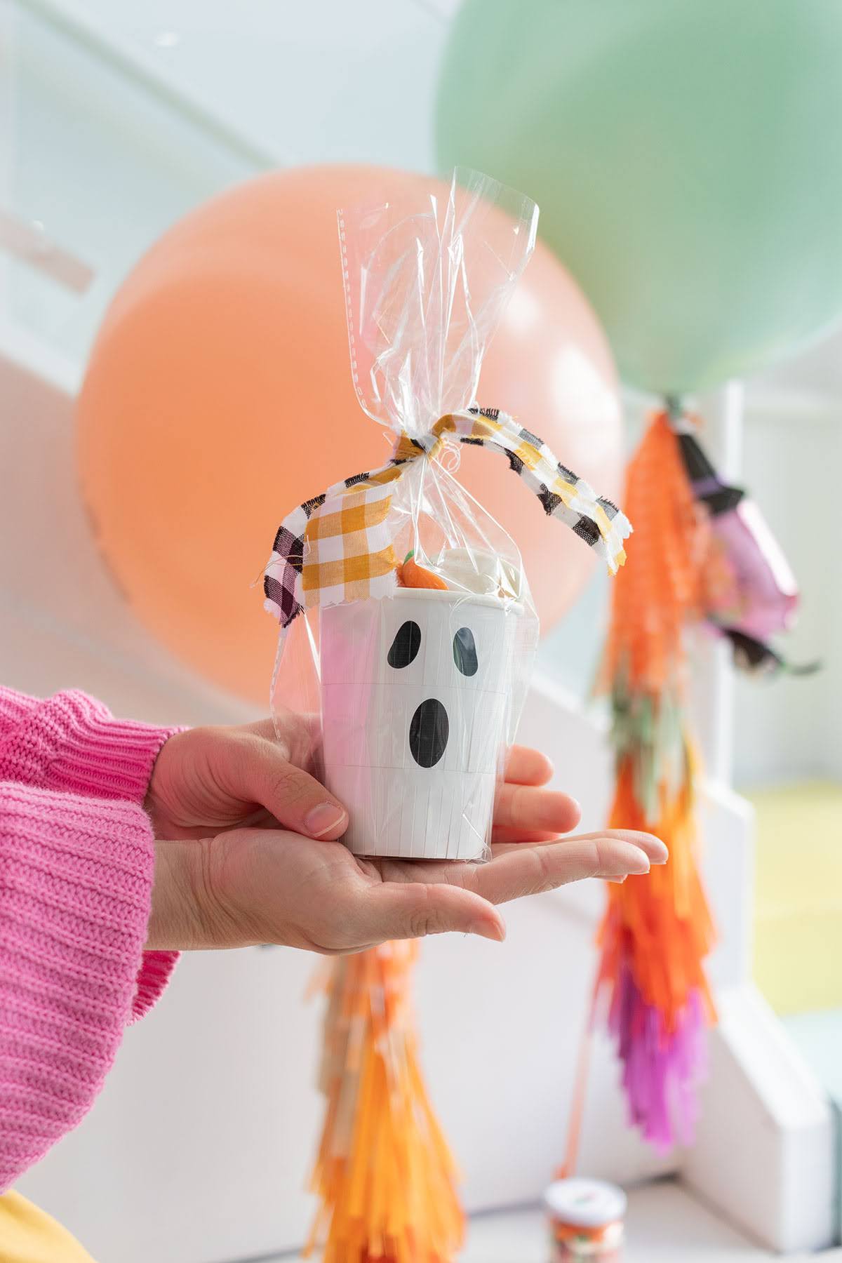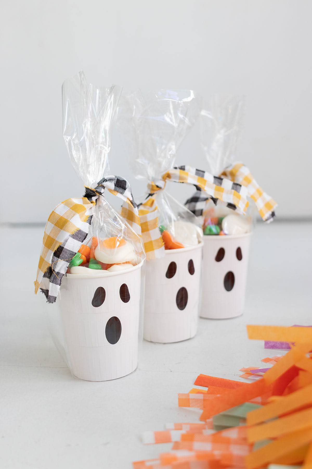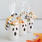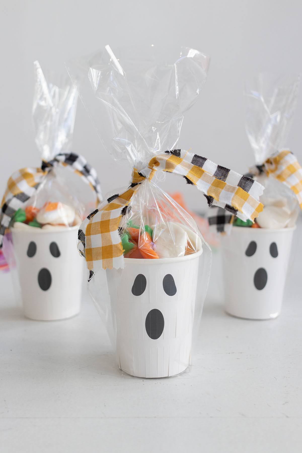 Vasito de fantasma relleno con chuches, empaquetado en un bolsa transparente y decorado con unos retales vichy. El vasito mide 9,5 cm.