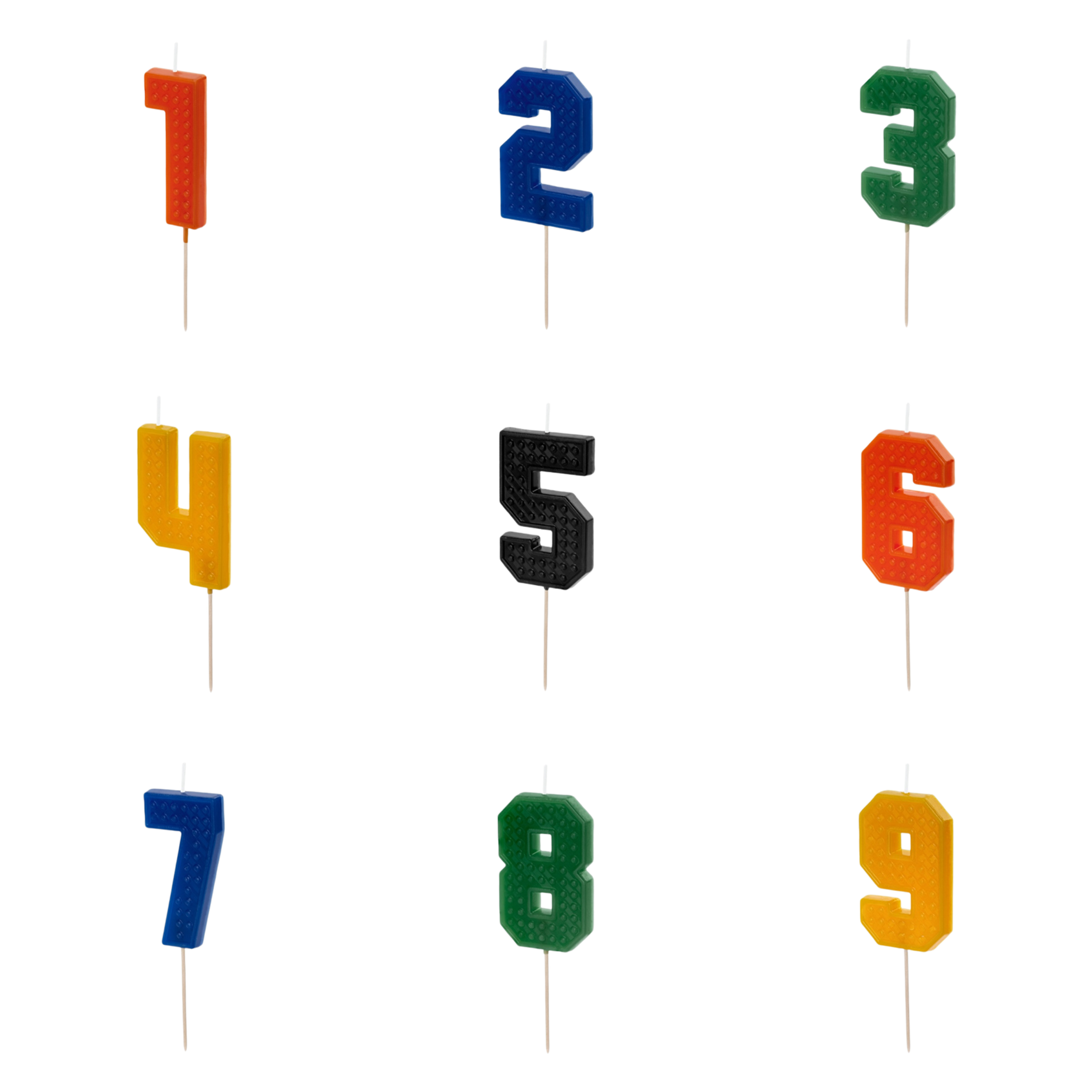 Velas de cumpleaños con número y diseño en relieve tipo bloques de construcción, ideal para decorar tartas y celebraciones temáticas tipo Lego.